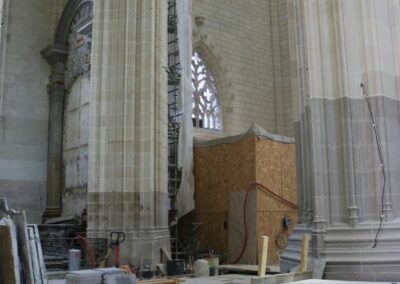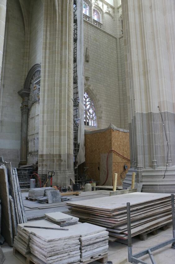 Les travaux de restauration du transept sud et du chœur sont à présent achevés. Le remontage de l’orgue de chœur est prévu pour les mois d’août et septembre. À la rentrée, débutera le chantier le plus important de cette restauration : celui du massif occidental. Il s’agit de la façade principale, côté place Saint-Pierre, ainsi que de la tribune d’orgue à l’intérieur de la cathédrale. Ce chantier colossal inclut également la verrière et l’orgue.