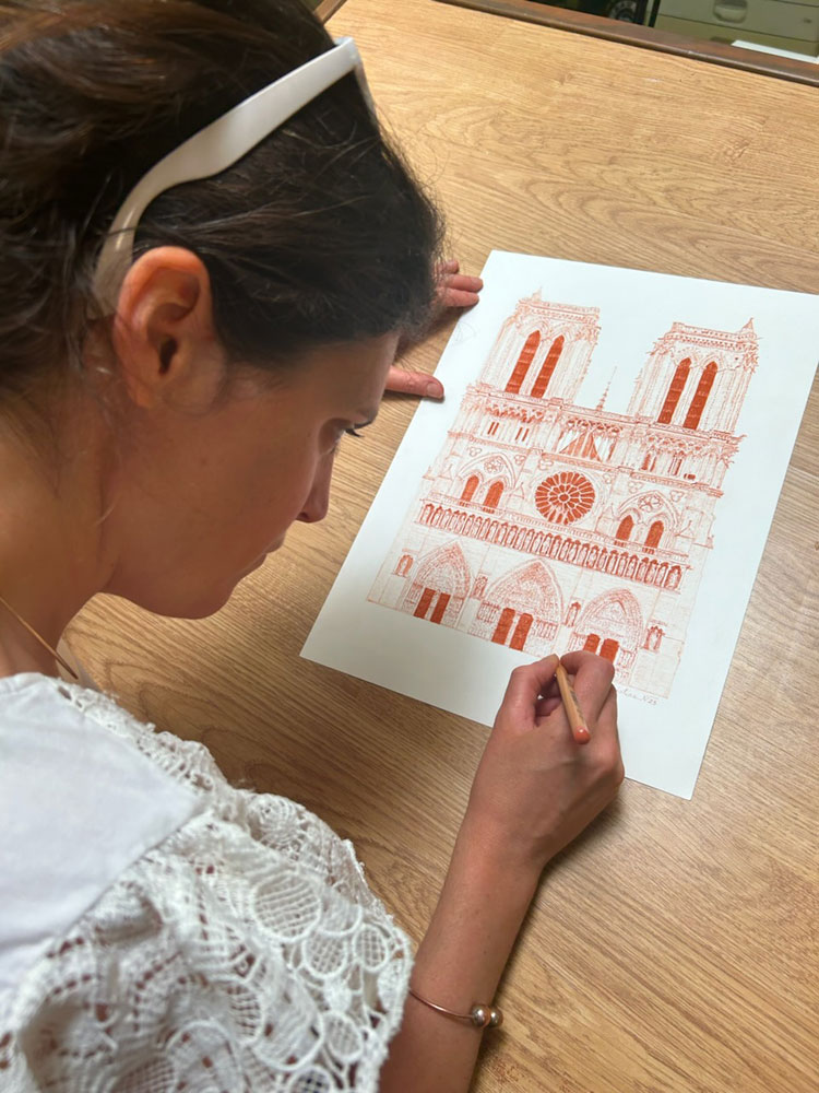 Avant de lancer mon entreprise, j’avais fait une retraite pour réfléchir à la direction que je voulais donner à mon activité. Ce jour-là, j’ai eu l’idée d’écrire une prière pour les personnes que je dessine. Je prie pour qu’elles avancent bien dans la vie, qu’elles rencontrent de belles personnes, et que, des années plus tard, en retrouvant leur portrait, cela leur rappelle quelque chose de leur enfance. Quand je dessine des maisons, je prie pour que ce soit un lieu d’unité, de paix et de joie. Ce sont deux petites prières que je relis avant de commencer un portrait, pour me mettre dans une disposition intérieure particulière. C’est un peu inspiré, très humblement, du processus de prière qui accompagne l’écriture d’une icône — ma belle-mère en écrit, et cela m’a beaucoup marquée.