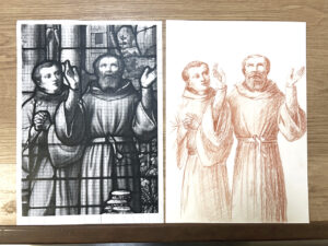 Je ne les ai pas cachés. Ils étaient là, sur mon bureau, visibles. Je me suis un peu demandé comment les autres allaient réagir. Dessiner des églises, c’est une chose, mais des prêtres ou des religieuses, c’est plus engageant. Je ne savais pas trop quel était le vécu de chacun. Et j’ai été agréablement surprise. Il y a eu une vraie ouverture. Les gens me demandaient : « Tiens, qu’est-ce que tu fais ? Raconte-moi… » C’était beau de voir des échanges naître autour de la vie de ces saints.