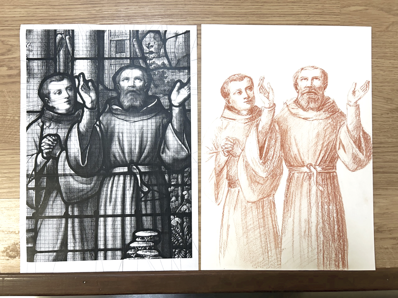 Pour les Témoins d’espérance, j’ai essayé de m’imprégner de leur vie pendant que je dessinais. J’écoutais des récits sur eux, notamment sur Louis-Marie Grignion de Montfort, sur lequel on trouve beaucoup de documents. Pour d’autres, il y avait moins de matière, alors je lisais les textes du livret. C’était très enrichissant. Par exemple, Anne-Françoise Moreau, qui dès l’enfance voulait partir en Chine — c’est incroyable ! Ou encore frère Célestin et frère Michel, ainsi qu’un autre frère de l’Abbaye de Bellefontaine : trois personnes qui, la même semaine, ont reçu l’appel à partir à Tibhirine. À travers leurs histoires, on perçoit vraiment le passage de l’Esprit Saint.