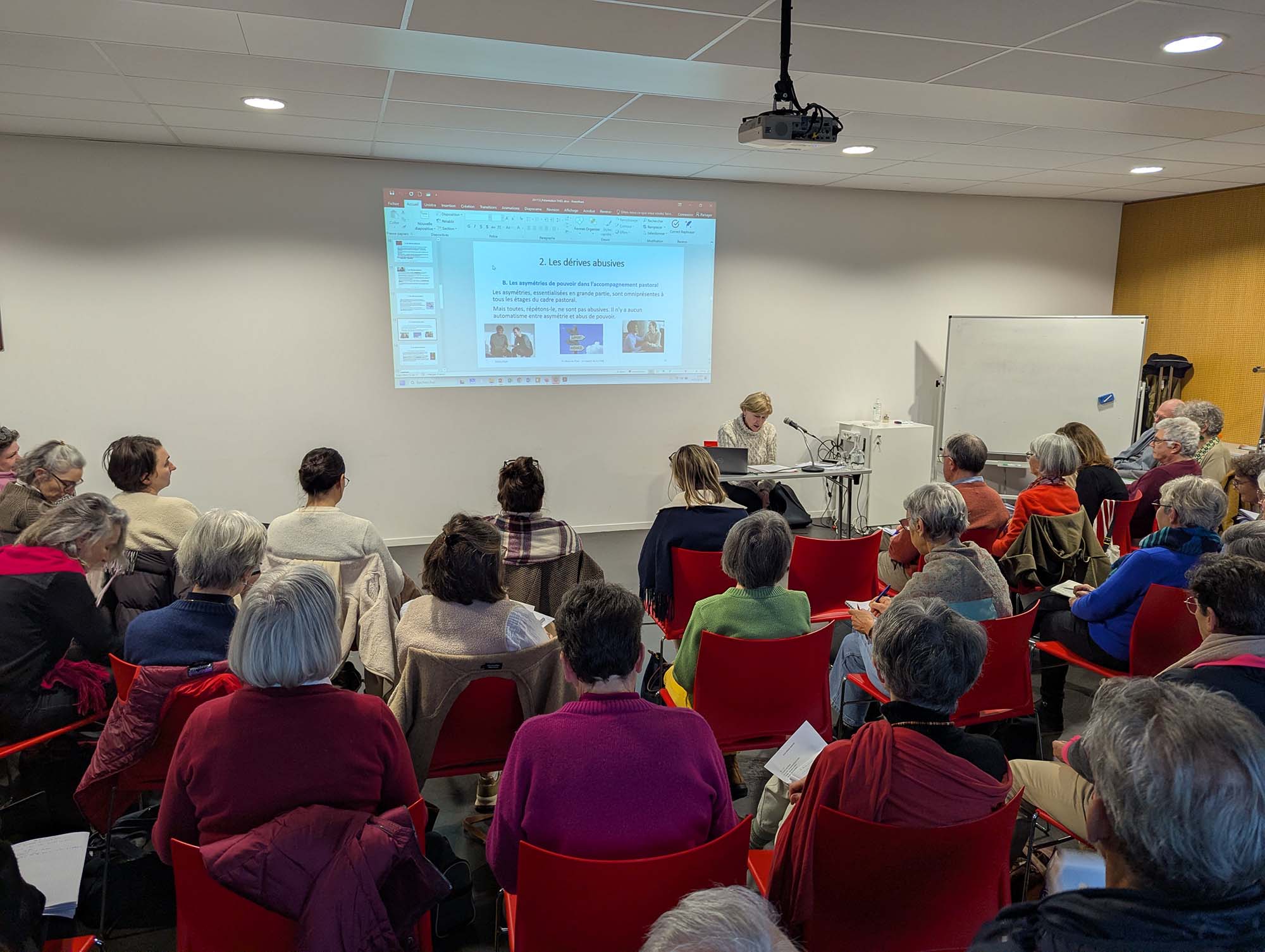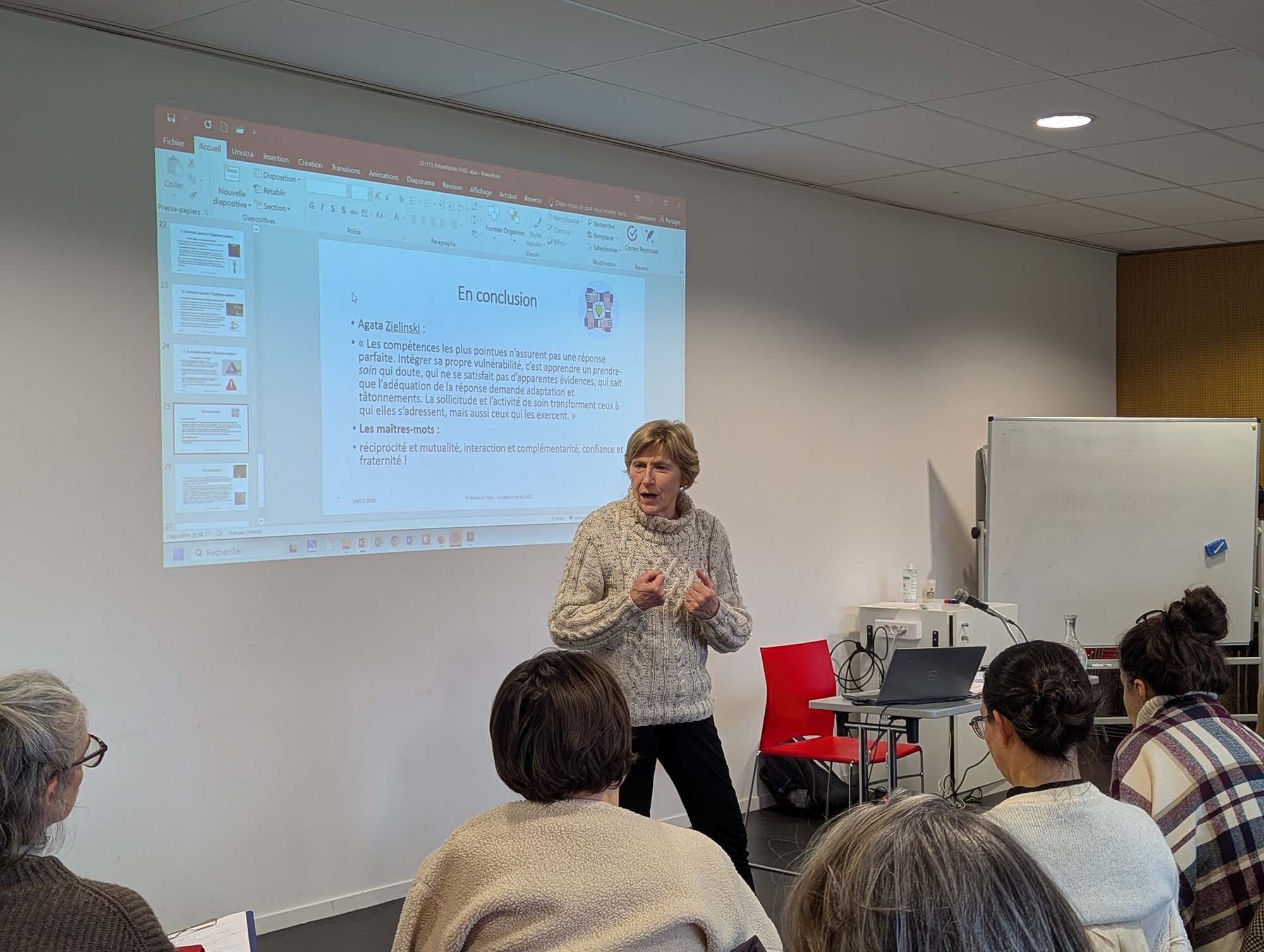 À travers ces journées de formation ouverte au grand public, il ne s’agissait pas seulement de parler de la mort, mais surtout de parler de la vie jusqu’à son terme, de l’accompagnement, de l’écoute, du soin et du respect de la personne. Comment être présents auprès de ceux qui vivent la fin de leur parcours ? Comment conjuguer compétence médicale, discernement éthique et attention à la dimension humaine et spirituelle ? Autant de questions que Madame Thiel nous aide à approfondir.