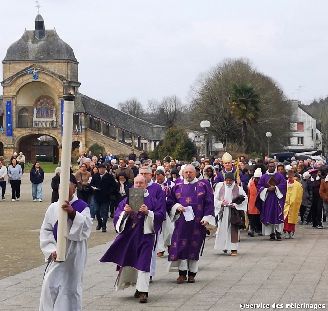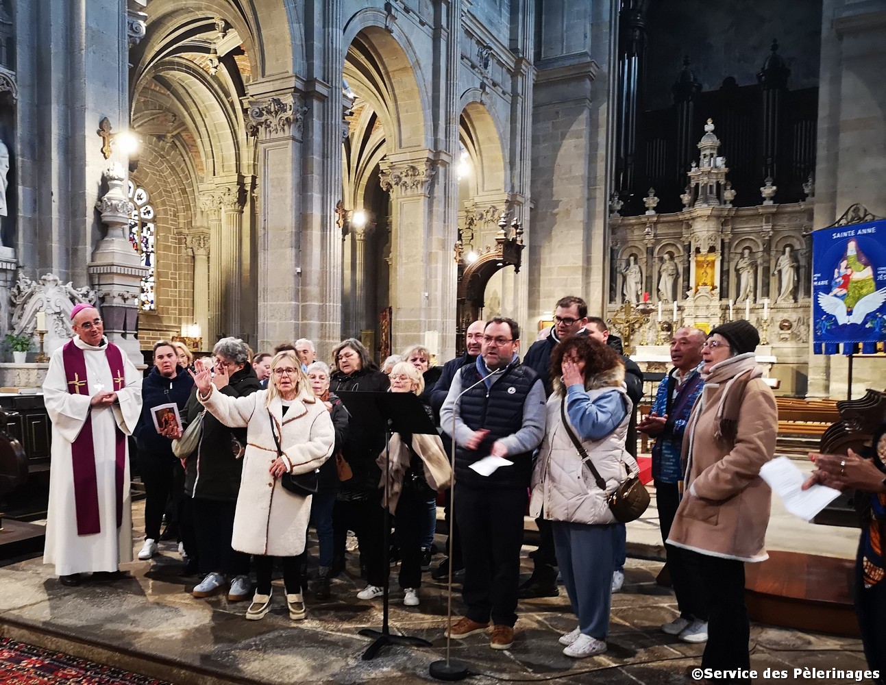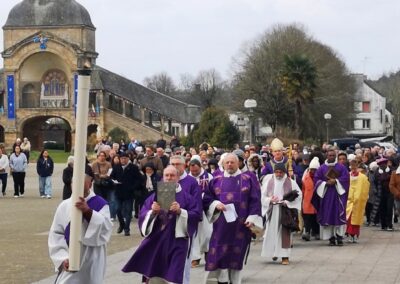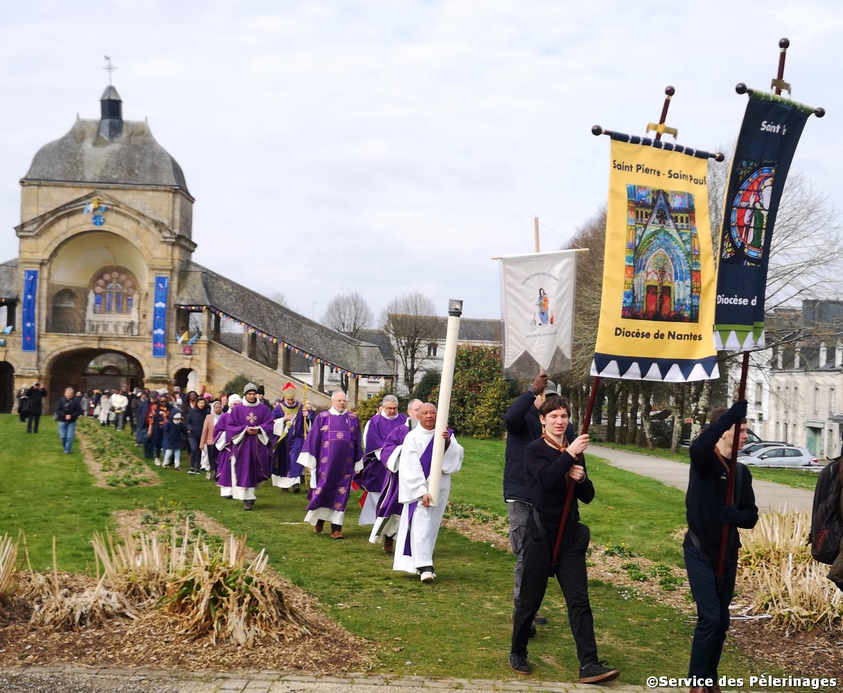 Ce dimanche 16 mars 2025, le service des pèlerinages a conduit une délégation diocésaine au sanctuaire de Sainte-Anne-d’Auray (56). Elle était composée de la pastorale de la Santé, avec les mouvements Lourdes Cancer Espérance, Amitié Espérance, la Fraternité Franciscaine Séculaire, les aumôniers hospitaliers de St Nazaire, de St Brévin, de Nantes, de Machecoul et des bénévoles paroissiaux du Service Évangélique des Malades en renfort au dispositif d’accompagnement étaient présents deux médecins et des scouts routiers, et de la Diaconie, avec le Secours Catholique, la pastorale des Migrants, l’aumônerie des Gens du voyage, mais aussi Chemin d’Espoir, l’aumônerie des prisons, la mission en quartiers populaires, ou encore des pôles solidarité. Ce temps fort doublement jubilaire (année de l’Espérance et 400ème anniversaire des apparitions de Ste Anne) était accompagné musicalement par la Pré Maîtrise, la Maîtrise de Musique Sacrée à la cathédrale de Nantes et animé par la chorale africaine. La journée était présidée par Mgr Laurent Percerou et a ravi ses presque 300 participants. Leurs échos traduisent l’émotion et l’ambiance de la journée.
