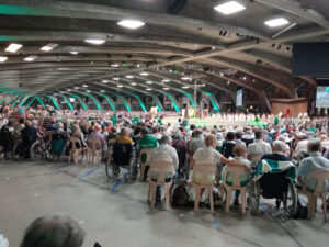 Et que dire du Chapelet le jeudi après-midi, suivi en plein soleil devant la Grotte pour les courageux ou à l’ombre de l’autre côté du Gave pour les autres ; quelle ferveur collective qui nous porte les uns vers les autres ; on oublie ses soucis, on les dilue dans la prière communautaire.