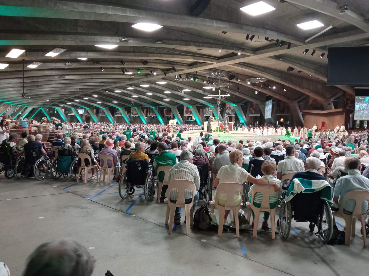 Nous étions 4200 à déambuler dans les sanctuaires et à nous retrouver dans la basilique St Pie X pour les célébrations eucharistiques. Un joyeux brouhaha remplit cette construction avant le début de chaque célébration puis un grand calme se fait : l’atmosphère devient subitement plus recueillie. Les processions d’entrée ont perdu le faste des années précédentes, c’est un retour à l’essentiel qui évite les comparaisons entre les travaux des délégations qui animent les diverses célébrations. Celles-ci sont toujours priantes, ponctuées de chants dont, hélas, nous ne comprenons pas toujours très bien ce que dit l’animateur Steve, mais la chorale menée de main de maître nous entraine à prier Marie et le Seigneur. N’oublions pas la procession eucharistique sous un soleil de plomb et le silence à la Grotte lors de la procession mariale ; ce silence qui m’a permis de prier ce que je n’arrive pas à faire dans la journée tellement ce lieu est bruyant.