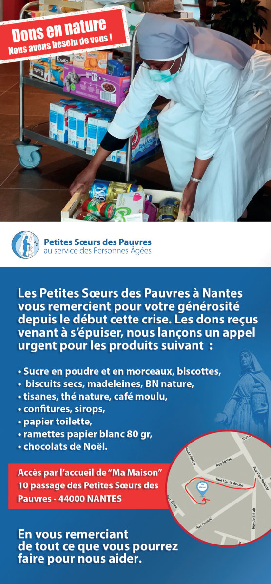 Le flyerLa communauté des Petites Sœurs des Pauvres à Nantes vous remercie de votre générosité depuis le début de cette crise sanitaire. Les dons reçus venant à s’épuiser, elle lance un appel urgent pour les produits suivants :