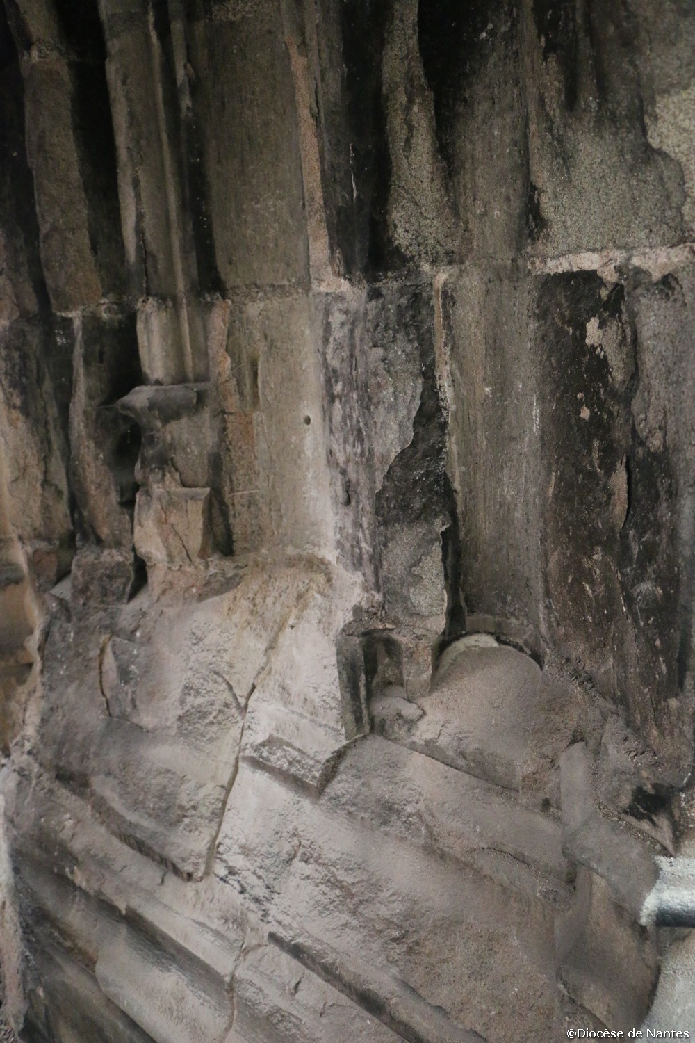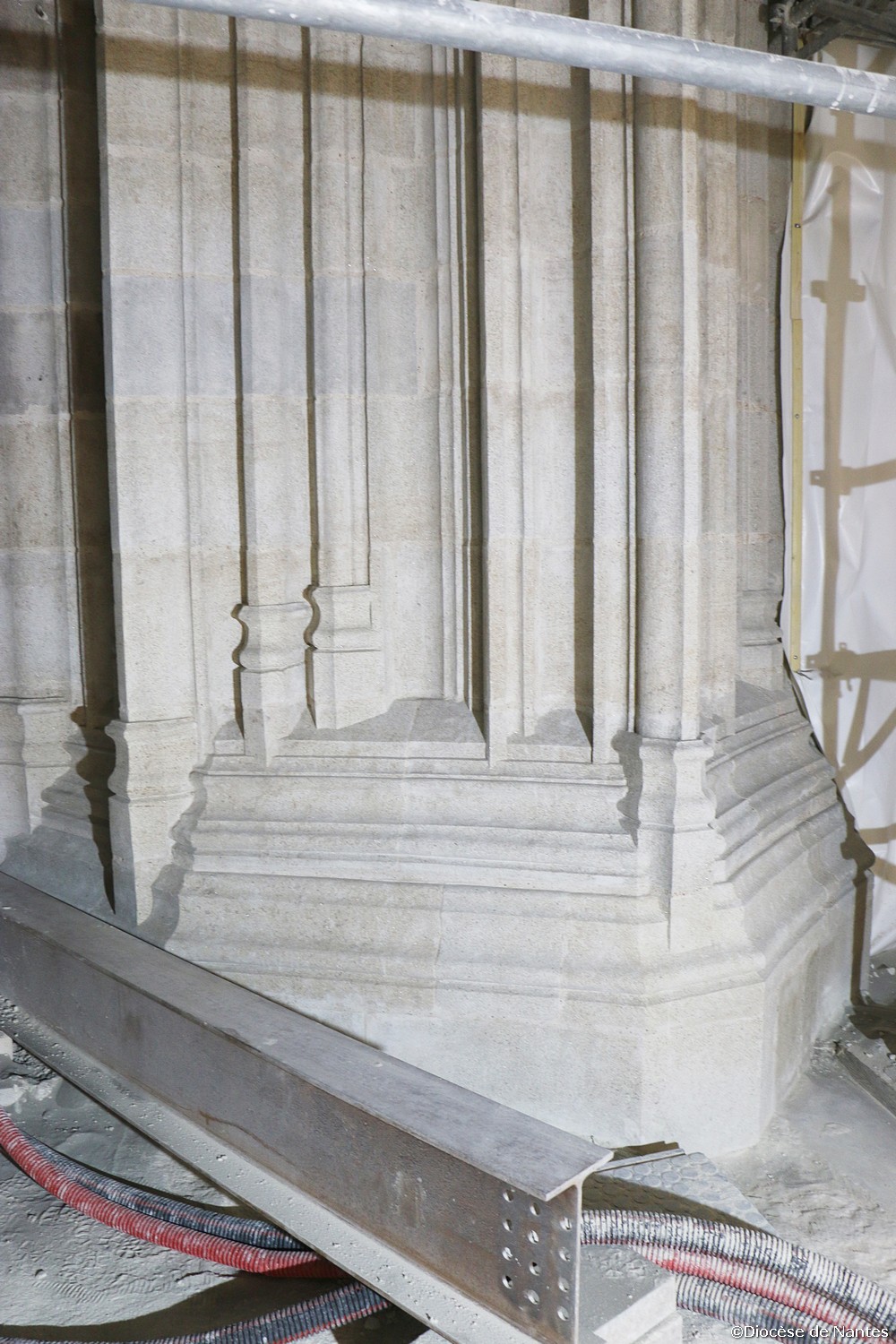 Après l’incendie criminel survenu le 18 juillet 2020, la cathédrale a fait l’objet d’importants travaux de dépollution, préalable au chantier de restauration qui a démarré à la fin de l’année 2023. La rénovation du chœur et du bras sud du transept sont en cours. Des travaux d’électricité, de sécurité et d’accessibilité ont également été entrepris à cette occasion. Le tombeau des Ducs de Bretagne qui est en cours de restauration et qui ne sera remonté qu’à partir de l’automne 2025. Mais déjà la base des piliers proches d’un des trois foyers de l’incendie, près de l’orgue de chœur, a été remplacée. Par un travail étonnant de changement des pierres en tiroirs, les équipes ont étayé les piliers au-dessus de la partie endommagée, pour en retirer les pierres noircies et déformées et les remplacer. « Chaque pierre pèse quasiment une tonne. On a profité de la réouverture d’une carrière de granit en Bretagne pour extraire, tailler et remplacer plusieurs pierres. »