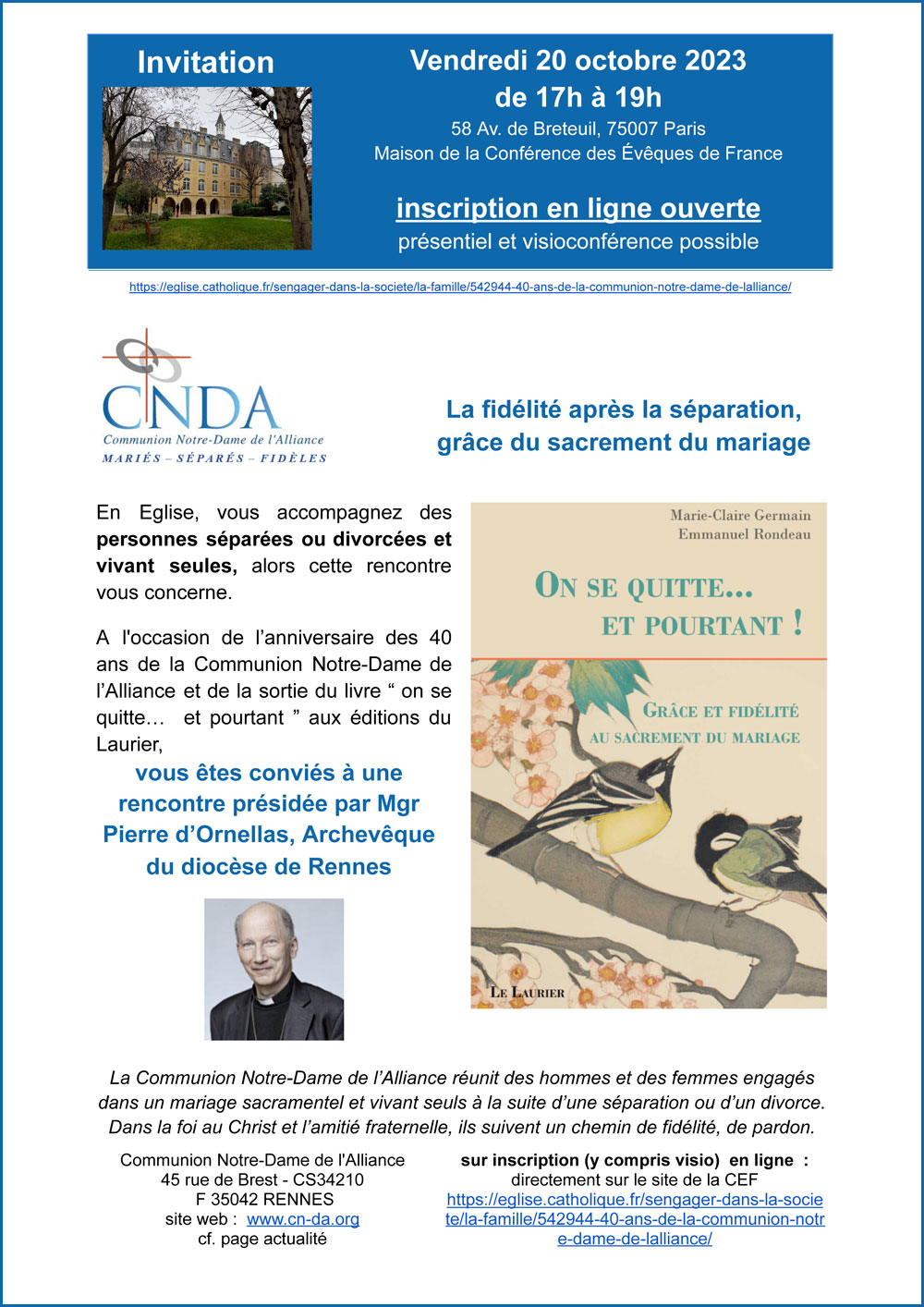 A l’occasion de l’anniversaire de ses 40 ans et de la sortie du livre « on se quitte… et pourtant » aux éditions du Laurier, la Communion Notre-Dame de l’Alliance est vous invite à une rencontre présidée par Mgr d’Ornellas, Archevêque du Diocèse de Rennes, en présence des auteurs, du Père Gérard Berliet et d’autres personnalités reconnues en accompagnement des personnes dans l’épreuve si douloureuse du divorce.