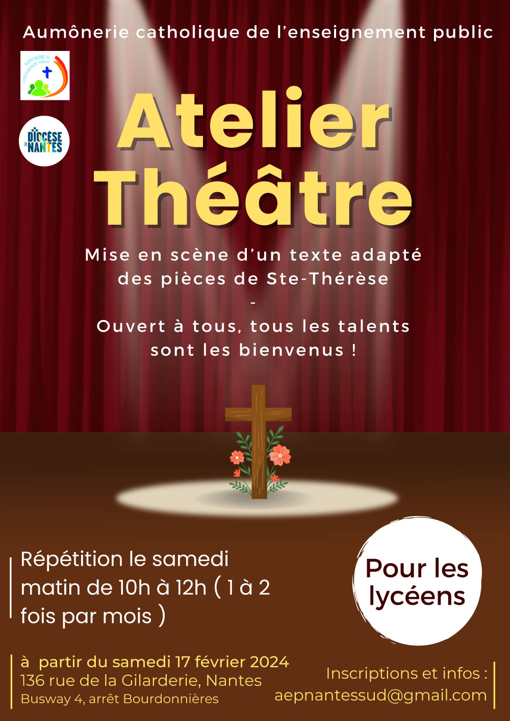 L’Aumônerie catholique de l’Enseignement Public (AEP) du diocèse de Nantes organise un atelier théâtre pour les lycéens (répétition le samedi matin de 10h à 12h, une à deux fois par mois).