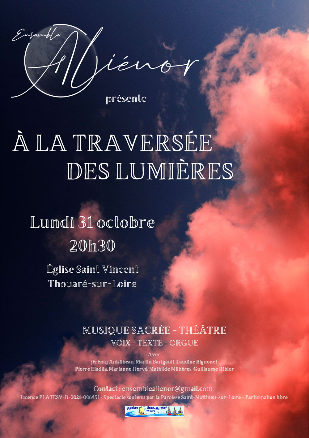 L’Ensemble Aliénor présente son spectacle « A la traversée des Lumières » en l’église Saint-Vincent à Thouaré-sur-Loire le lundi 31 octobre 2022 à 20h30.