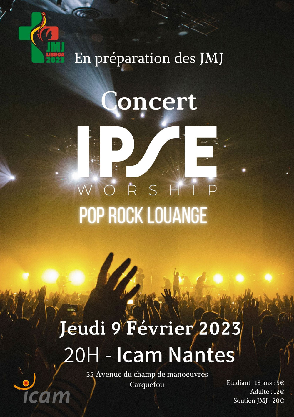 Sur le chemin des JMJ de Lisbonne, l’aumônerie de l’Icam vous propose un concert de louange animé par le groupe Ipse Worship (Angers) le jeudi 9 février 2023 de 20h à 21h30 à la salle polyvalente de l’Icam (35 avenue du Champ de Manœuvre, 44470 Carquefou)