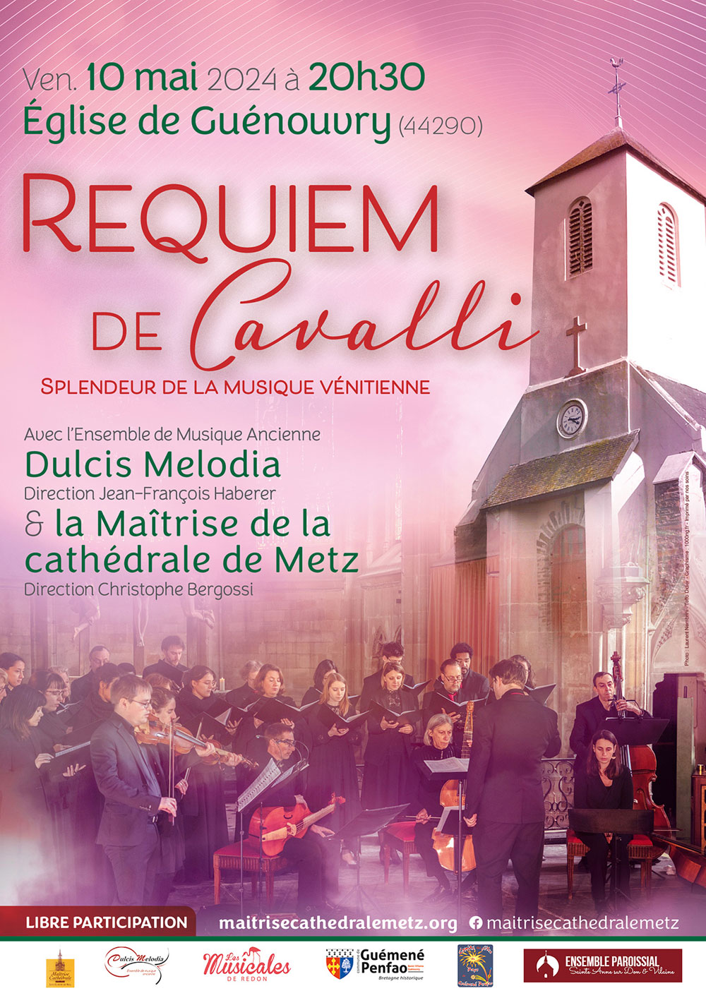 Vendredi 10 mai 2024 à 20h30, l’église de Guénouvry (paroisse Sainte-Anne-en-Guémené-Plessé) accueille un concert exceptionnel, le Requiem de Cavalli, avec l’Ensemble de Musique Ancienne Dulcis Melodia et la Maîtrise de la cathédrale de Metz.