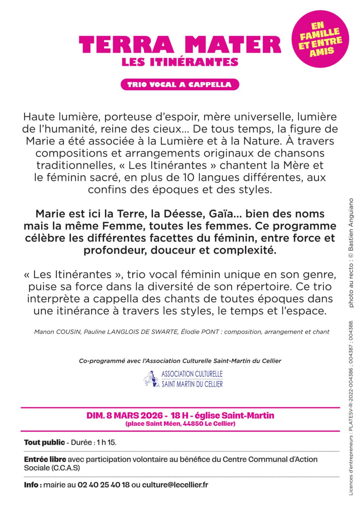 L’Association Culturelle Saint Martin du Cellier, en partenariat avec la commune du Cellier, est heureuse de vous inviter à son premier concert 2026 le dimanche 8 mars 2026 à 18h avec « Les Itinérantes », trio vocal à capella, en l’église Saint-Martin du Cellier.