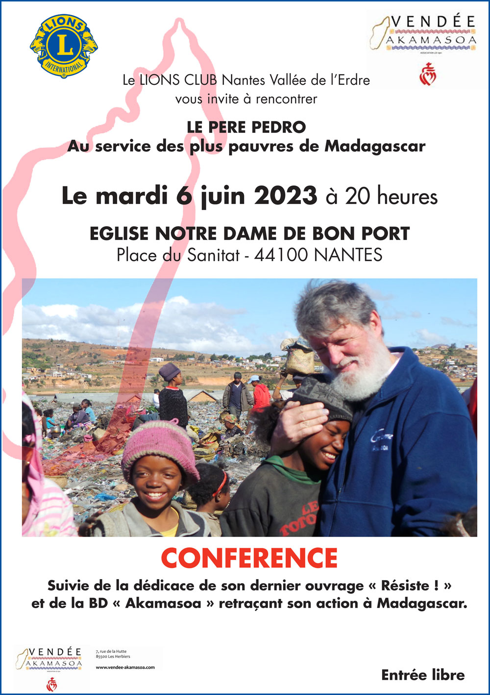 Le Lions Club Nantes Vallée de l’Erdre vous invite à rencontrer le Père Pedro, prêtre au service des plus pauvres de Madagascar le mardi 6 juin 2023 à 20h en l’église Notre-Dame-de-Bon-Port (paroisse Notre-Dame-de-Nantes). La conférence sera suivie d’une dédicace du dernier ouvrage du père Pedro «Résiste ! » et de la BD « Akamasoa » retraçant son action à Madagascar.