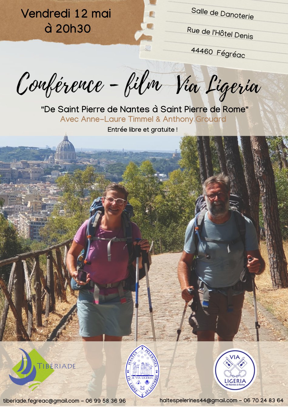 L’association Tibériade de la paroisse Saints-Riowen-et-Méreal-sur-Vilaine propose une conférence-film sur la Via Ligeria : « De Saint Pierre de Nantes à Saint Pierre de Rome » le vendredi 12 mai 2023 à 20h30 à Fégréac (Salle de Danoterie – rue de l’Hôtel Denis – 44460 Fégréac).