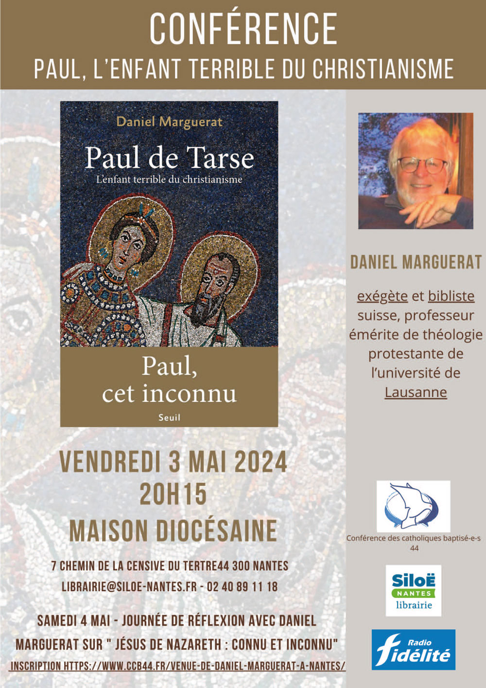 Conférence « Paul, l’enfant terrible du christianisme » de Daniel Marguerat (*) le vendredi 3 mai 2024 à 20h15 à la Maison Diocésaine (7 chemin de la Censive du Tertre – 44300 Nantes) organisée par La librairie Siloë, la CCB44 en partenariat avec Radio fidélité.