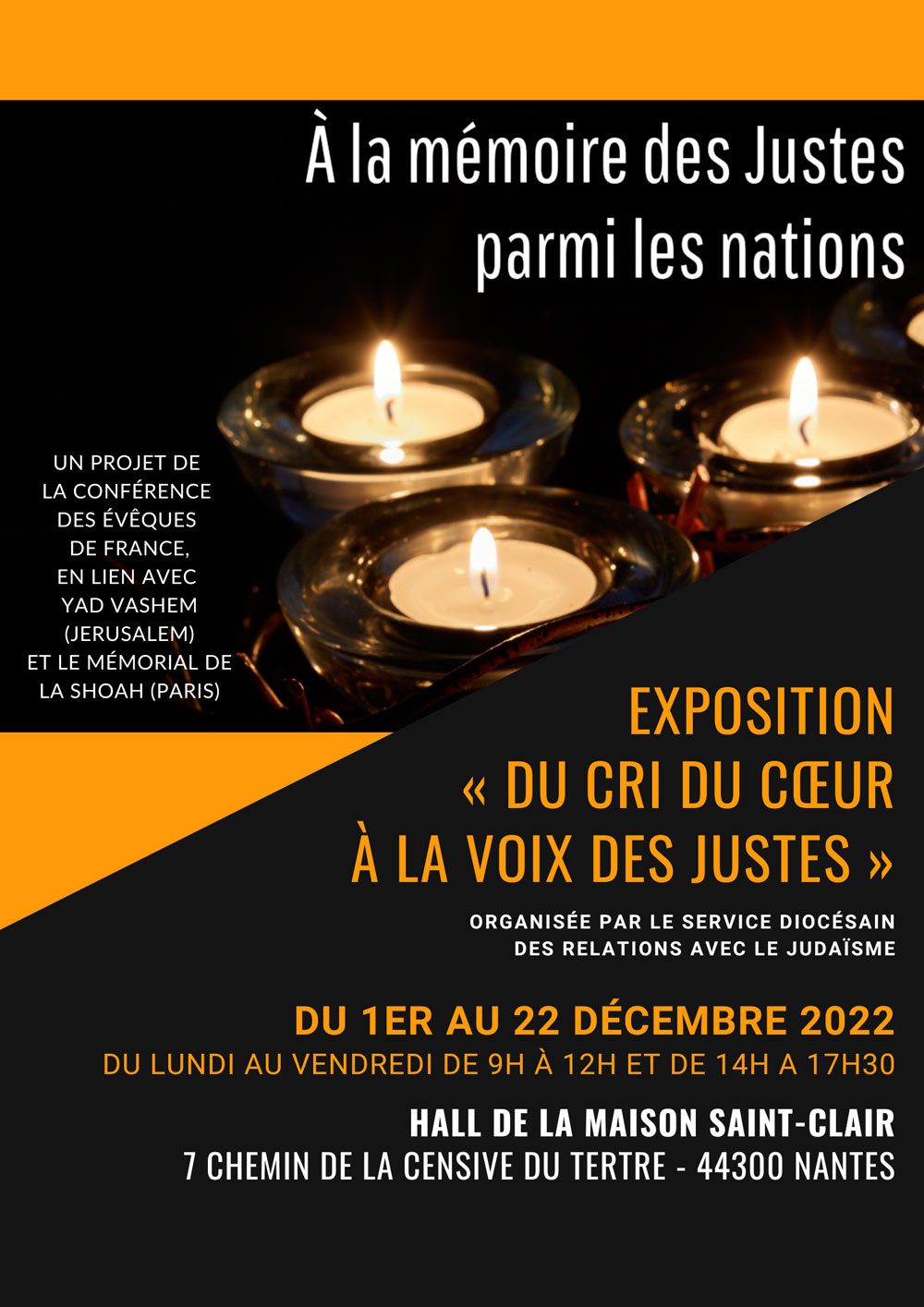 Le Service diocésain des relations avec le Judaïsme (SDRJ) organise une exposition « Du cri du cœur à la voix des Justes » du 1er au 22 décembre 2022 (lundi au vendredi de 9h à 12h et de 14h à 17h30) dans le hall de la Maison Saint-Clair (7 chemin de la Censive du Tertre – 44300 Nantes). Cette exposition itinérante s’inscrit dans le cadre du projet « À la mémoire des Justes parmi les nations » initié par la Conférence des Évêques de France (CEF) en lien avec Yad Vashem (Jérusalem) et le Mémorial de la Shoah (Paris).