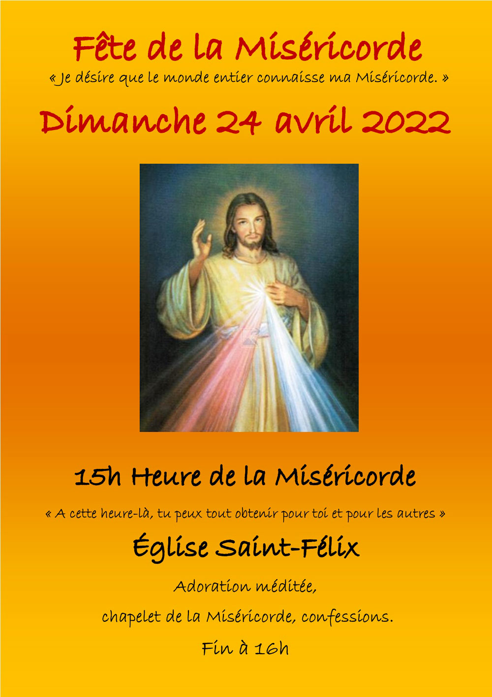 La paroisse des Saints-Evêques-de-Nantes vous invite à célébrer la Divine Miséricorde le dimanche 24 avril 2022 à 15h en l’église Saint-Félix de Nantes.