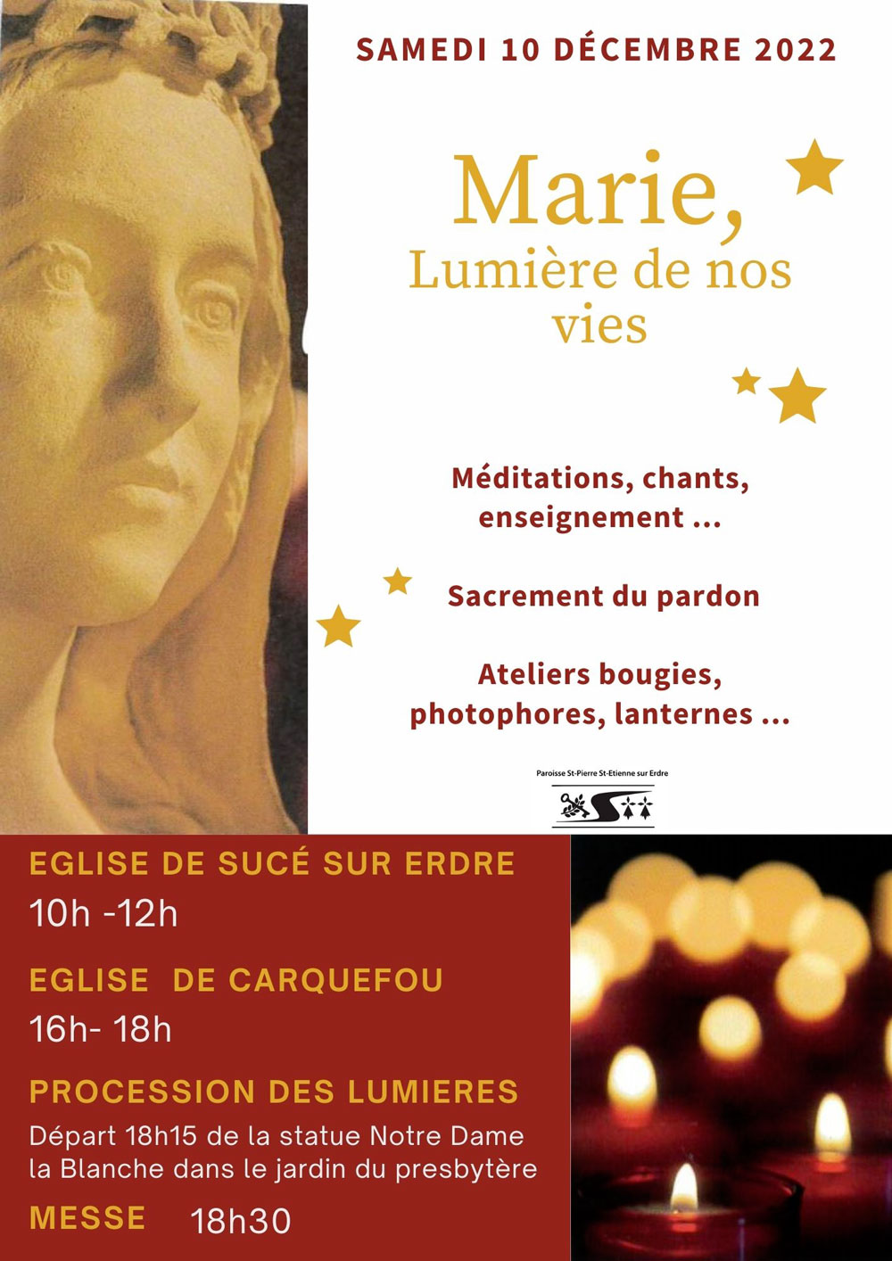 Dans le cadre de la Fête des Lumières, la paroisse Saint-Pierre-Saint-Etienne-sur-Erdre organise un temps fort le samedi 10 décembre 2022 : « Marie, Lumière de nos vies ».
