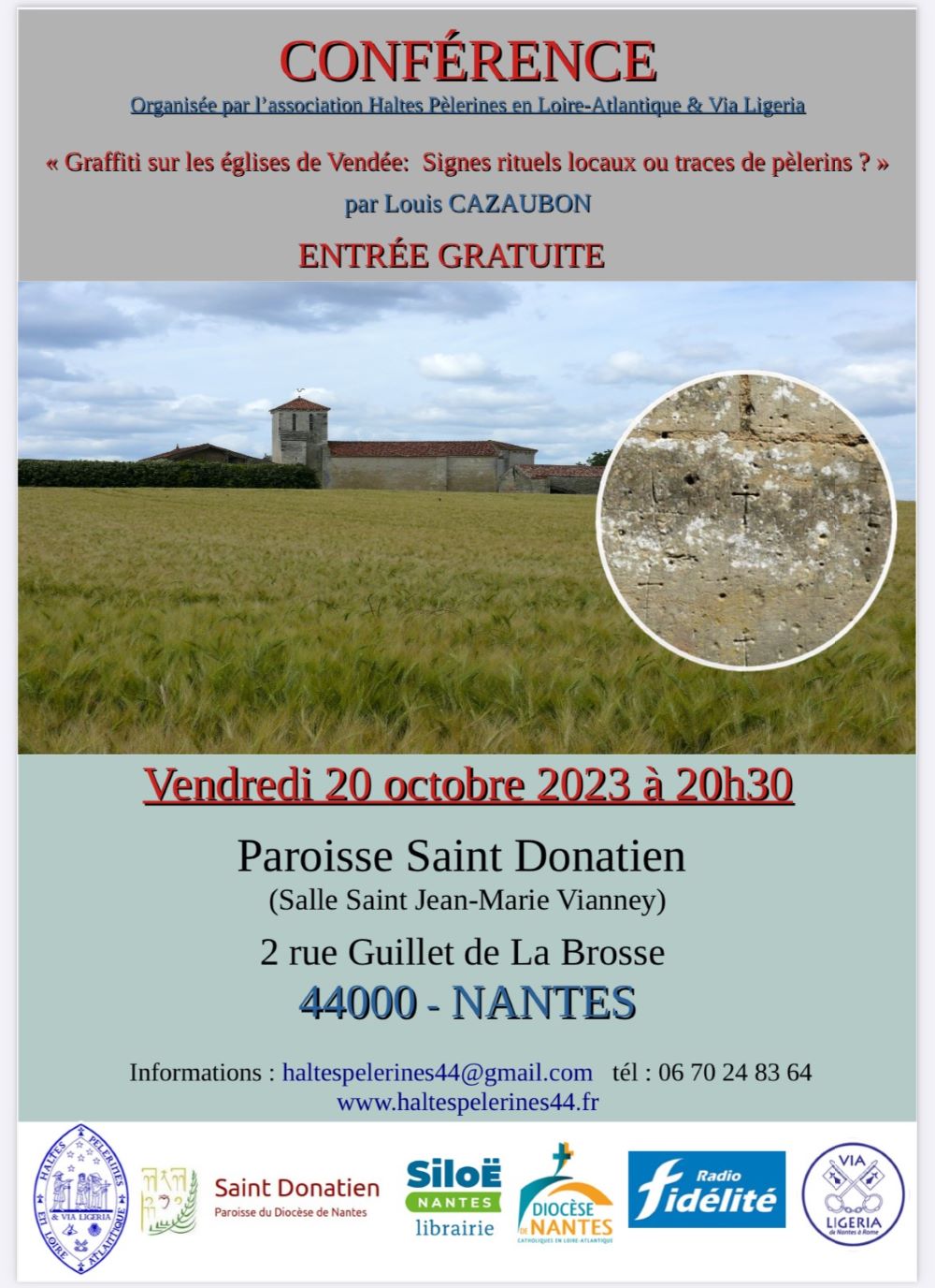 Le vendredi 20 octobre, l’association des Haltes pélerines en Loire-Atlantique et Via Ligeria organise en lien avec la paroisse Saint-Donatien, la Librairie Siloé, et Radio Fidélité une conférence présentée par Louis Cazaubon « Graffiti sur les églises de Vendée : signes rituels locaux ou traces de pèlerins ? ».