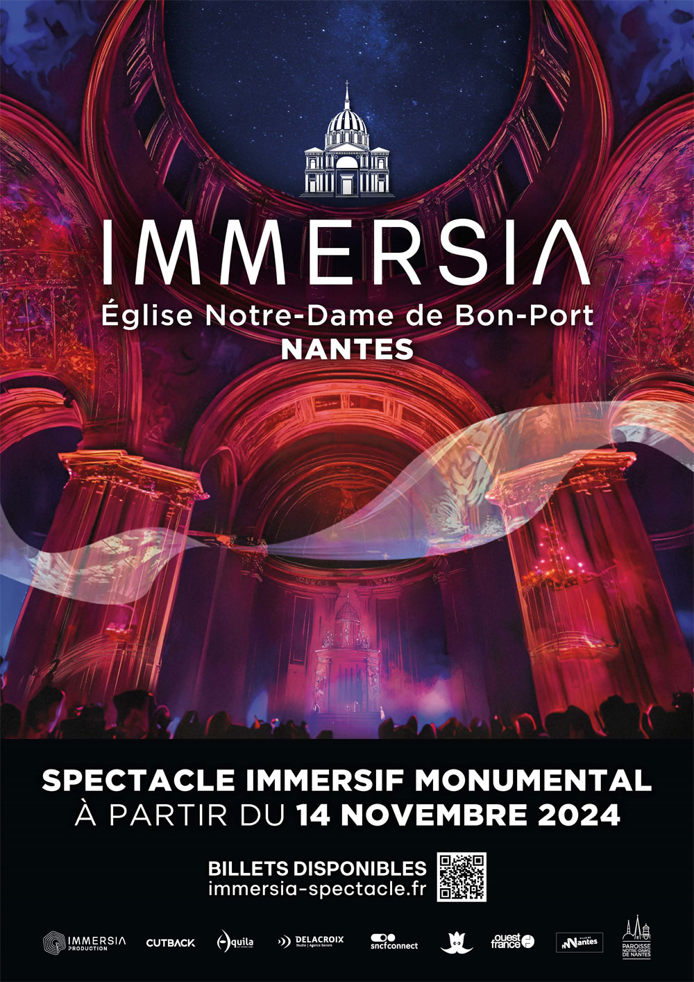 Le dôme de Notre-Dame de Bon-Port sera à la fois l’écrin majestueux et la figure centrale du spectacle. L’œuvre immersive IMMERSIA – Au fil de l’eau, la lumière est inspirée de la symbolique du fronton de l’église qui évoque le départ en mer et le retour à bon port des marins nantais.