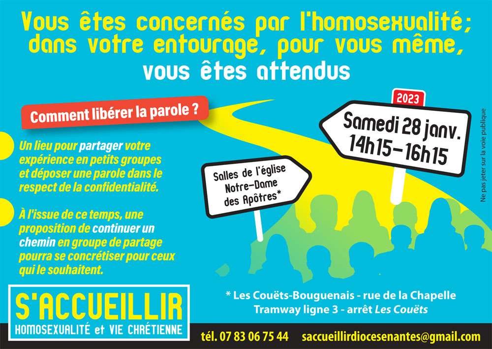 Le groupe S’Accueillir du diocèse dont la mission est de réfléchir à « Homosexualité et Vie chrétienne » vous invite (ceux qui désirent approfondir la pensée de l’Église concernant les personnes homosexuelles…) à une journée d’échanges et de partages, le samedi 28 janvier 2023 de 14h15 à 16h15 dans les salles de l’église Notre-Dames des Apôtres (Les Couëts-Bouguenais – rue de la Chapelle – 44340 Bouguenais).