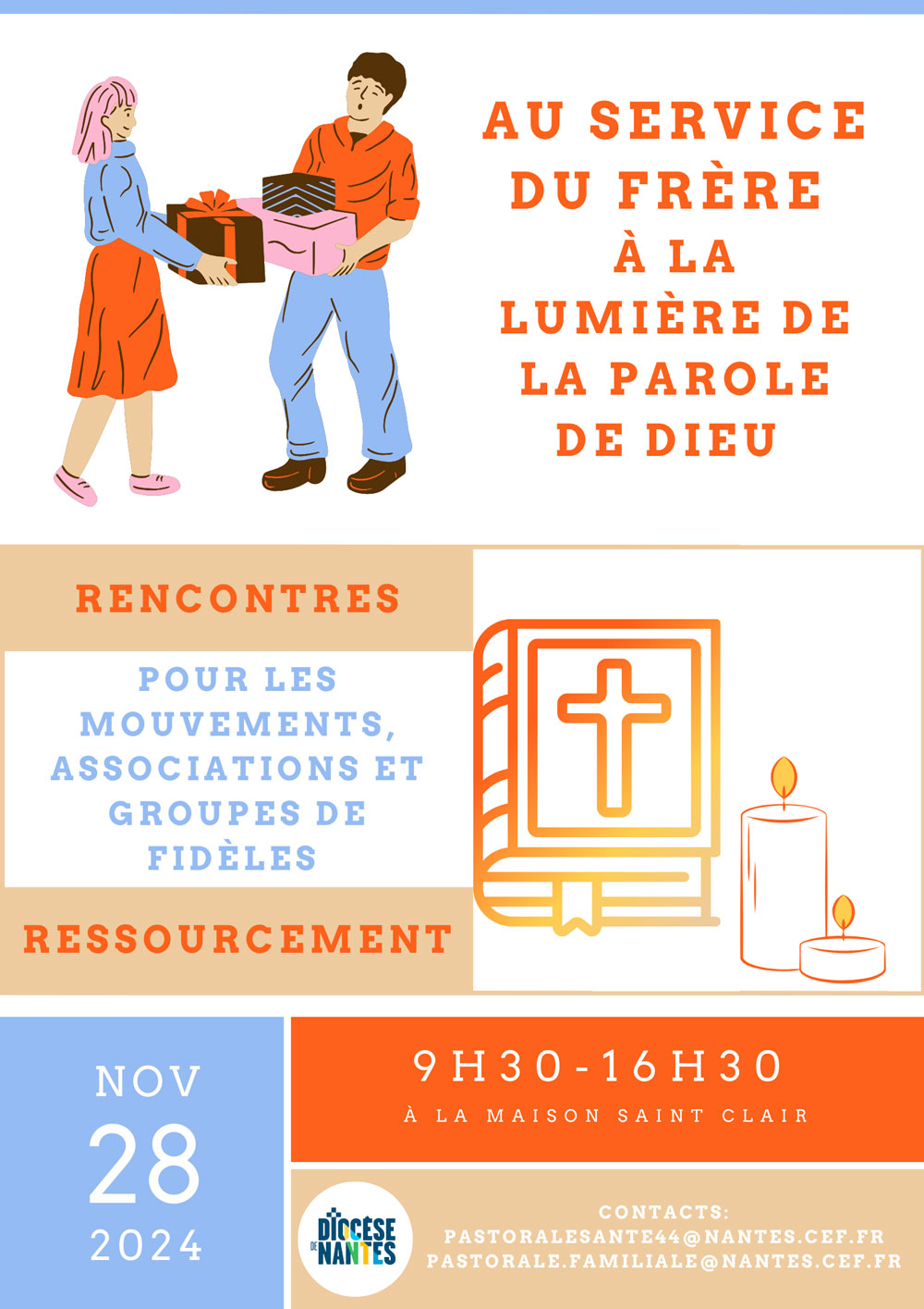 À toutes les personnes, groupes, associations de fidèles et mouvements au service du frère, vous êtes invités le jeudi 28 novembre 2024 de 9h30 à 16h30 à la Maison diocésaine Saint-Clair à une journée présidée par le père Guillaume Danno, prêtre accompagnateur de la pastorale des familles, en présence de Christian Clavier, nouveau délégué aux mouvements et associations de fidèles.