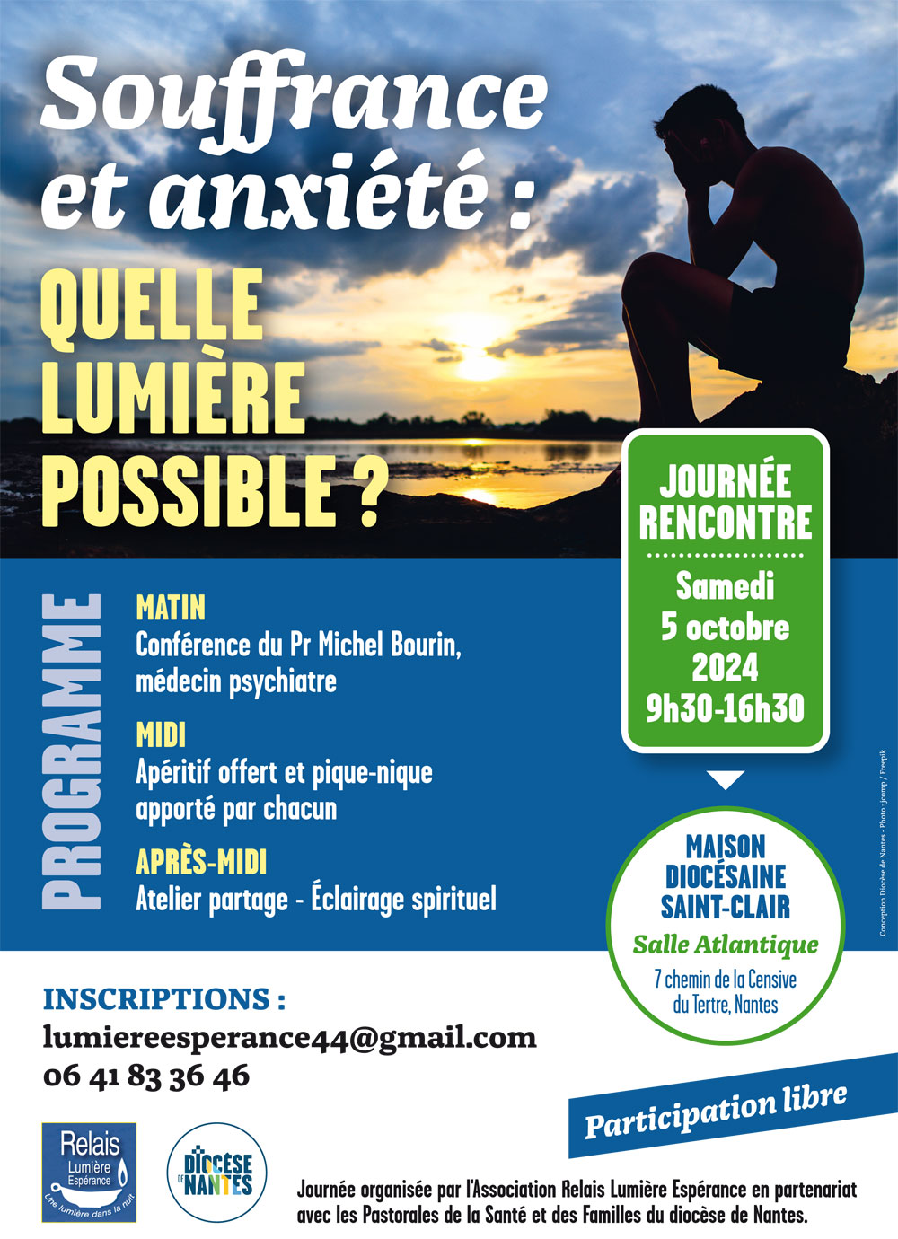 Journée rencontre avec pour thème « Souffrance et anxiété : quelle lumière possible ? » le samedi 5 octobre 2024 de 9h30 à 16h30 à la Maison diocésaine Saint-Clair organisée par l’association Relais Lumière Espérance en partenariat avec les Pastorales de la Santé et des Familles du diocèse de Nantes.