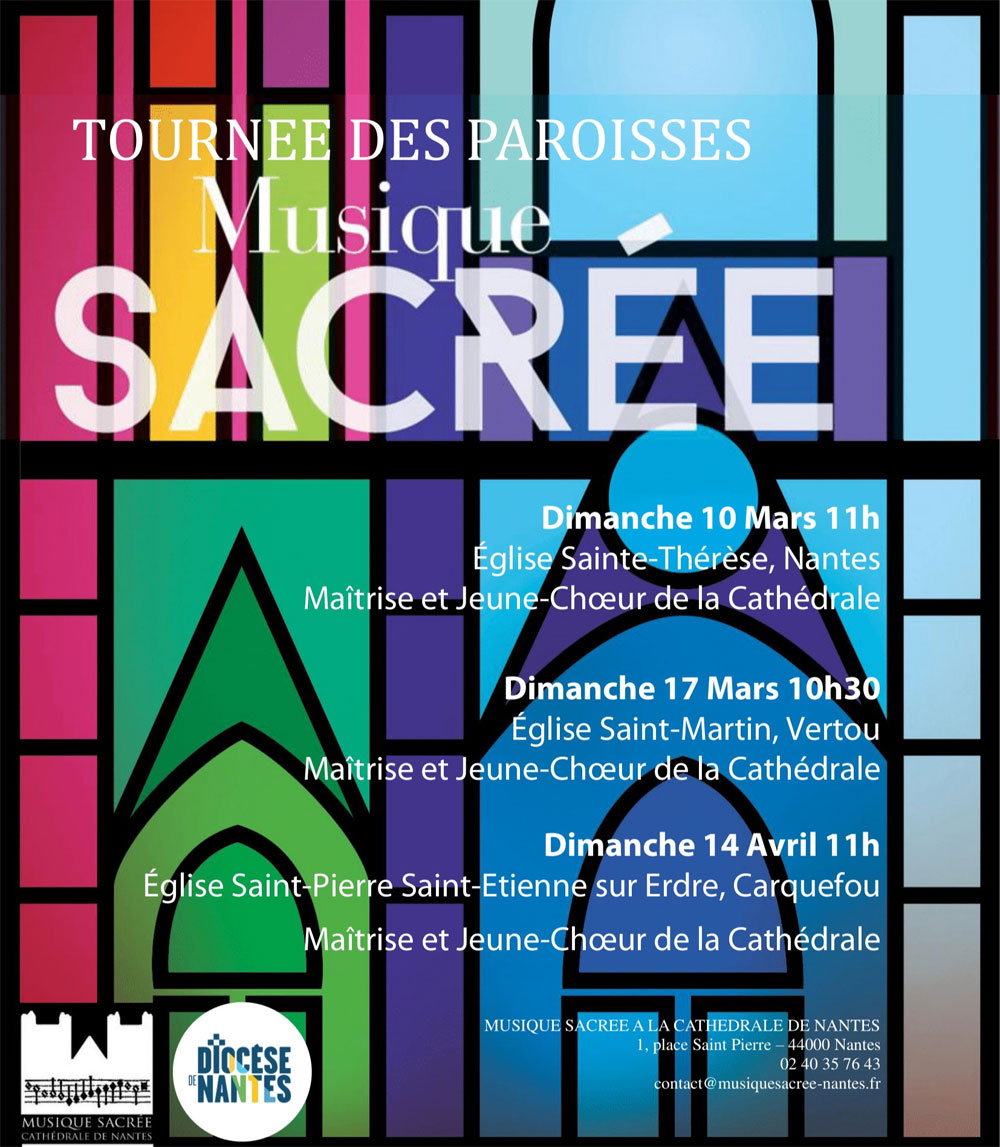 Dans le cadre de la « Tournée des paroisses de Musique Sacrée« , la Maitrise et le Jeune Chœur de la Cathédrale se produiront le dimanche 14 avril 2024 à 11h en l’église paroissiale de Carquefou (paroisse Saint-Pierre Saint-Etienne-sur-Erdre).