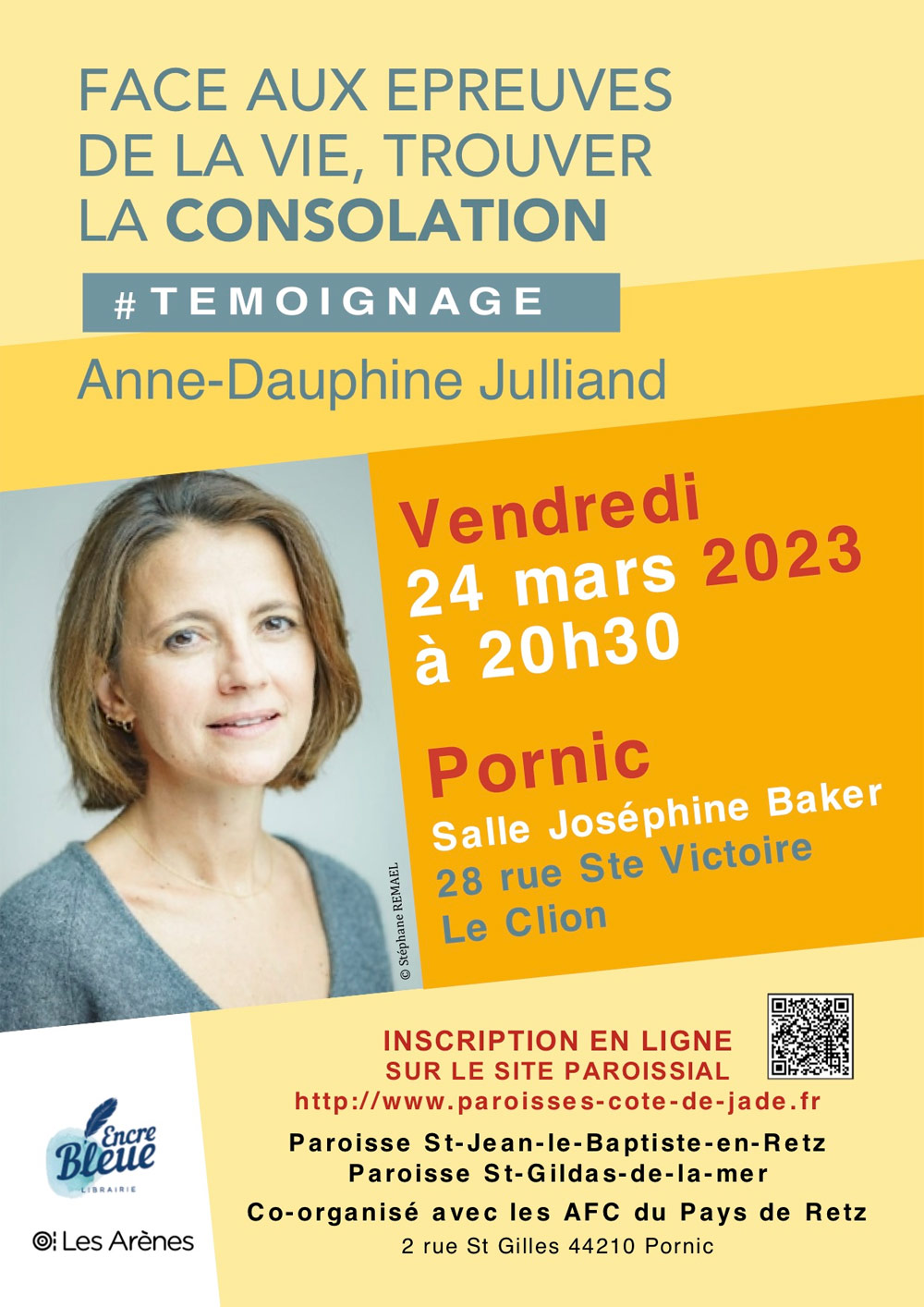 Le 24 mars 2023, Anne-Dauphine Julliand sera à Pornic, (salle Joséphine Baker du Clion) à 20h30 pour parler de son livre Consolation. Comment à l’heure de l’épreuve du prochain, il est important de franchir le pas de la peur et de la retenue. Il est alors urgent d’oser et de s’approcher. Quelques mots suffisent : « Je suis là », « Vous avez du prix à nos yeux ». La personne en souffrance se sent alors rejointe dans sa peine. Comme le dit Anne-Dauphine Julliand : « La consolation n’est pas chasser la souffrance, c’est apporter la Paix pour permettre de vivre pleinement la souffrance. Consoler c’est chasser la peur ». Un Témoignage fort et profond porteur de réconfort !