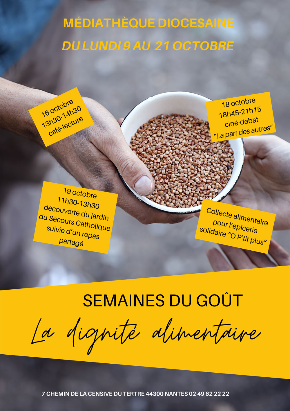 Comme chaque mois d’octobre, la médiathèque diocésaine fête le goût et cette année, en partenariat avec le Secours Catholique, nous avons choisi de réfléchir autour du thème de la Dignité alimentaire, qui au-delà de l’aide alimentaire, interroge ce qui entre en jeu de culture, de liens et de construction de soi dans le simple fait de manger.