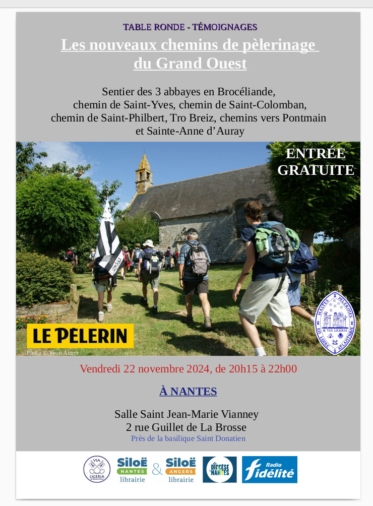L’association Haltes pèlerines en Loire – Atlantique et Via Ligeria organise une soirée table ronde le 22 novembre 2024 (20h15 – 22h00 à Nantes) sur les nouveaux chemins de pèlerinage du Grand Ouest :