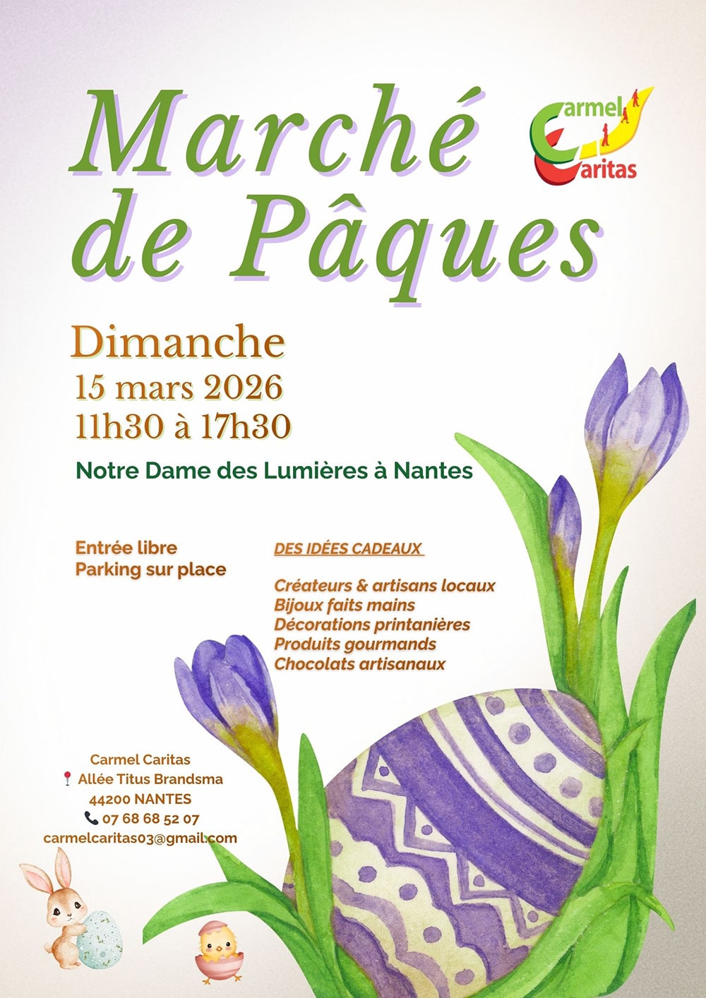 Carmel Caritas vous invite à son Marché de Pâques, au bénéfice de ses projets humanitaires, le dimanche 15 mars 2026 de 11h30 à 17h30 au Couvent Notre Dame de Lumières (Allée Titus Brandsma – 44200 Nantes).