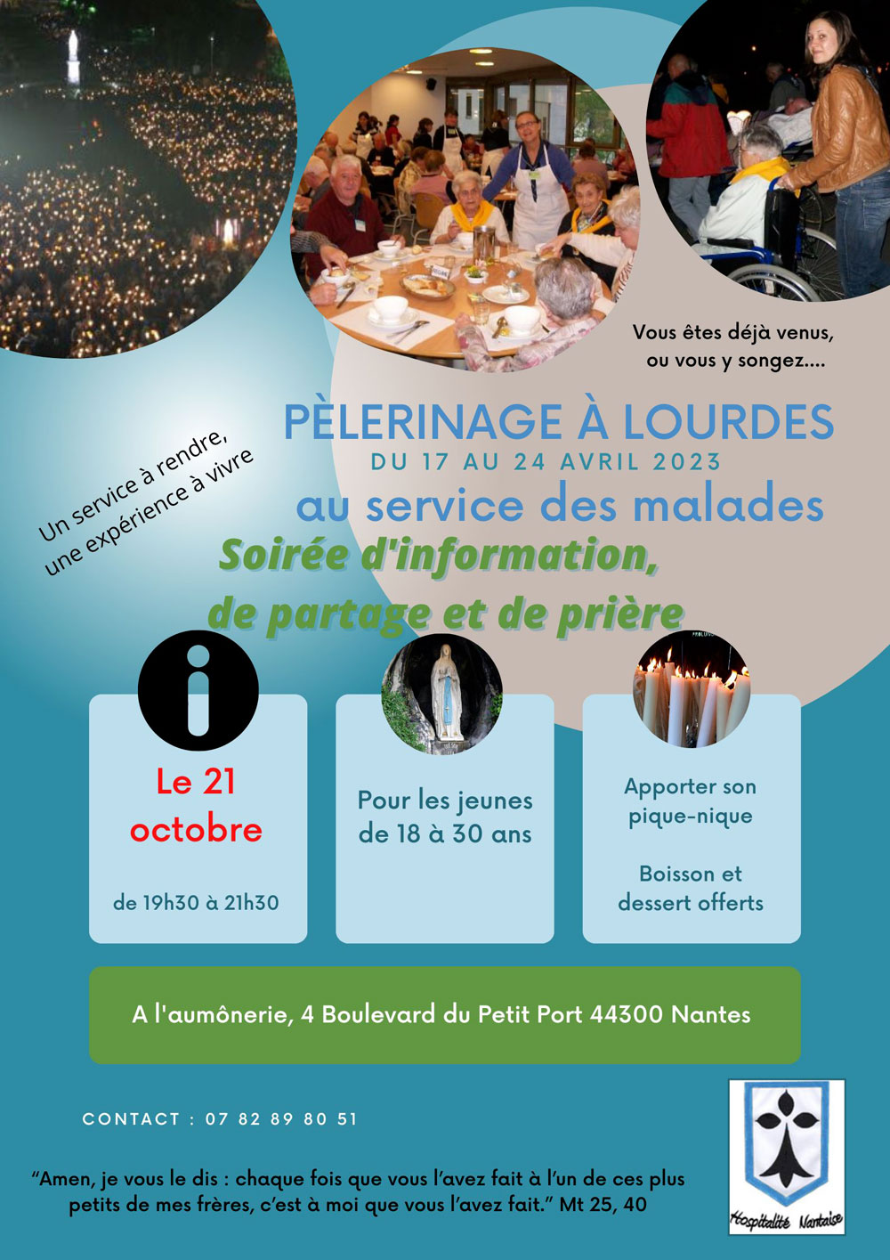 L’Hospitalité Nantaise vous invite à une soirée d’information, de partage et de prière consacrée au service des malades pour le Pèlerinage à Lourdes qui aura lieu du 17 au 24 avril 2023. Cette soirée, à destination des jeunes de 18 à 30 ans, aura lieu le vendredi 21 octobre 2022 de 19h30 à 21h30 à l’Aumônerie du Petit-Port (4 bd du Petit-Port – 44300 Nantes).