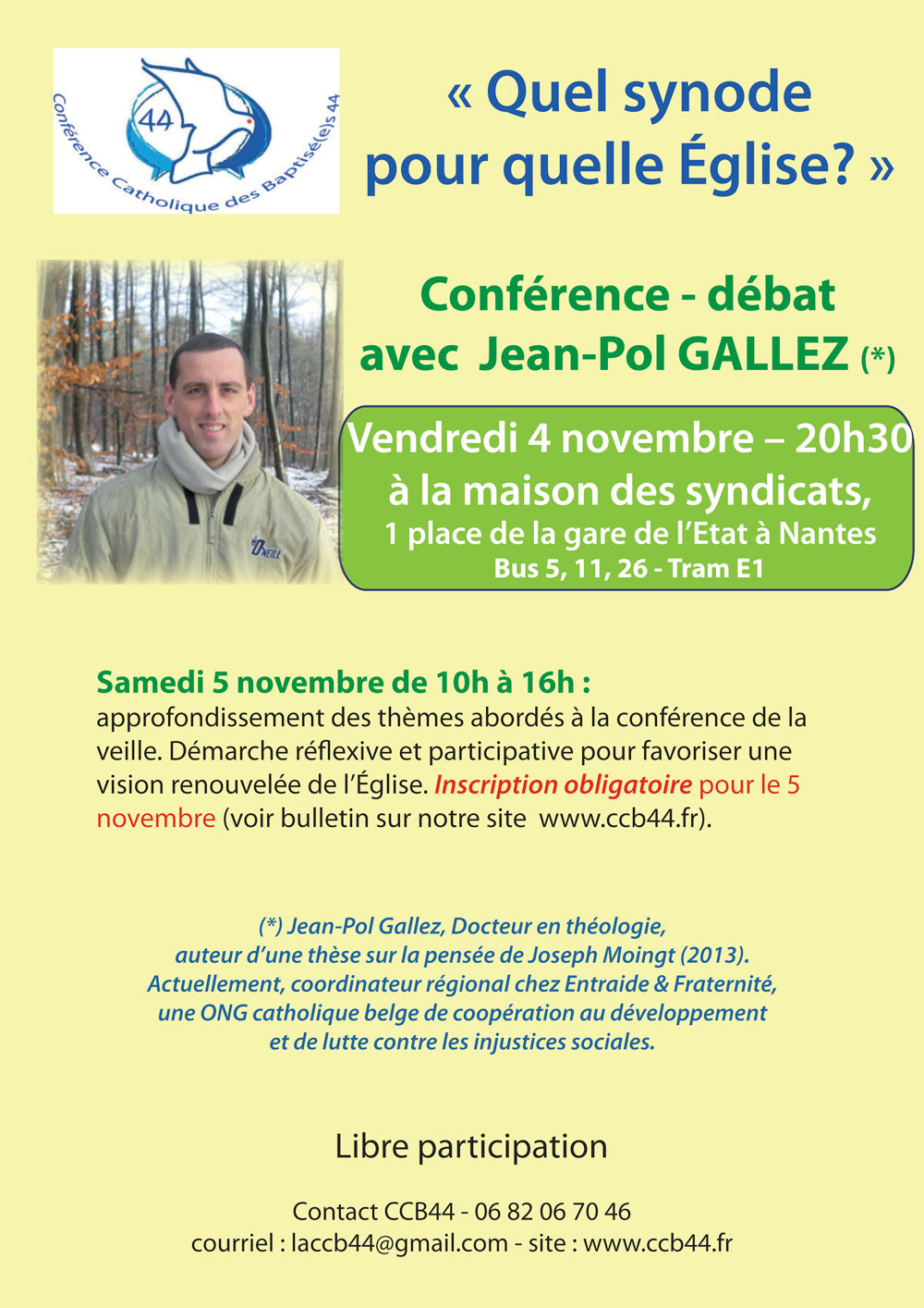 Conférence-débat avec Jean-Pol Gallez avec pour thème « Quel Synode pour quelle Église ? » le vendredi 4 novembre 2022 à 20h30 à la maison des syndicats, 1 place de la gare de l’état – Nantes