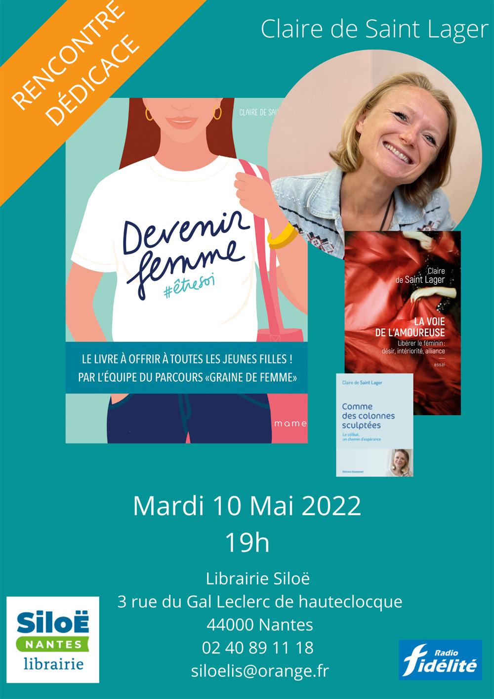 Rencontre dédicace avec Claire de Saint Lager, auteure de « Devenir femme », le mardi 10 mai 2022 à 19h à la librairie Siloë (3 rue du général Leclerc de Hauteclocque à Nantes, près de la Cathédrale).