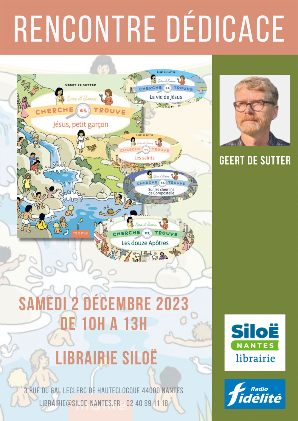 Geert de Sutter est l’auteur de la collection : « Cherche et trouve Sara et Simon » qui évoque la vie de Jésus et des saints. Il sera présent le 2 décembre 2023 de 10h à 13h à la librairie Siloë (3 rue du Gal Leclerc de Hauteclocque – 44000 Nantes)
