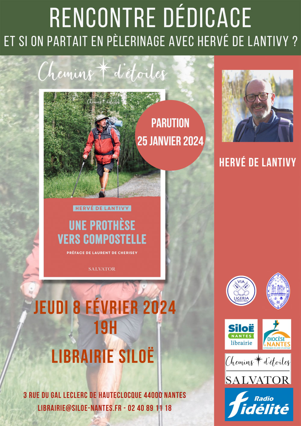 Rencontre-dédicace avec Hervé de Lantivy le 8 février 2024 à 19h à la librairie Siloë (3 rue du Gal Leclerc de Hauteclocque – 44000 Nantes) autour de son livre « Une prothèse vers Compostelle » (parution 25 janvier 2024).