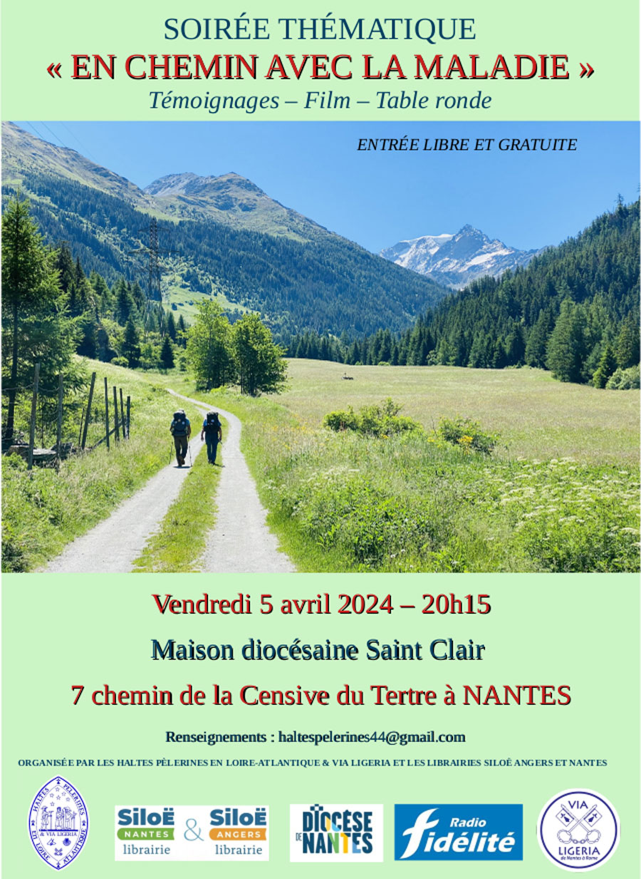 L’association Haltes pèlerines en Loire-Atlantique et Via Ligeria et les librairies Siloë Angers et Nantes vous invitent à une soirée thématique « En chemin avec la maladie » le vendredi 5 avril 2024 à 20h15 à la Maison diocésaine Saint Clair.