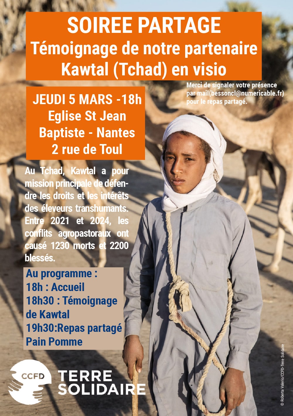Soirée partage avec le CCFD – Terre Solidaire et son partenaire Kawtal (Tchad) en visio le jeudi 5 mars 2026 à 18h en l’église Saint Jean Baptiste de Nantes (2 rue de Toul – 44000 Nantes)