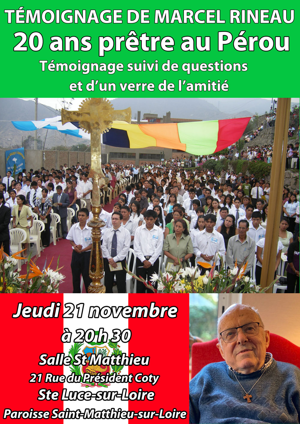 La paroisse Saint-Matthieu-sur-Loire vous invite à une soirée témoignage du père Marcel Rineau le jeudi 21 novembre 2024 à 20h30 à la salle Saint-Matthieu à Sainte-Luce-sur-Loire.