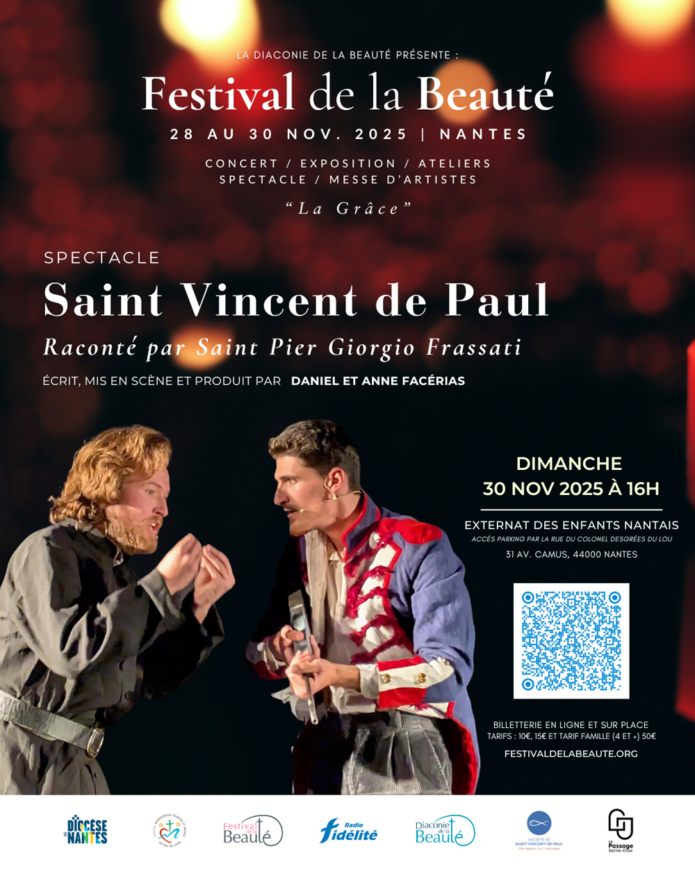 Dans le cadre du Festival de la Diaconie de la Beauté à Nantes, L’externat des Enfants Nantais accueille le spectacle « St Vincent de Paul raconté par St Pier Giorgio Frassati » le dimanche 30 novembre 2025 à 16h.