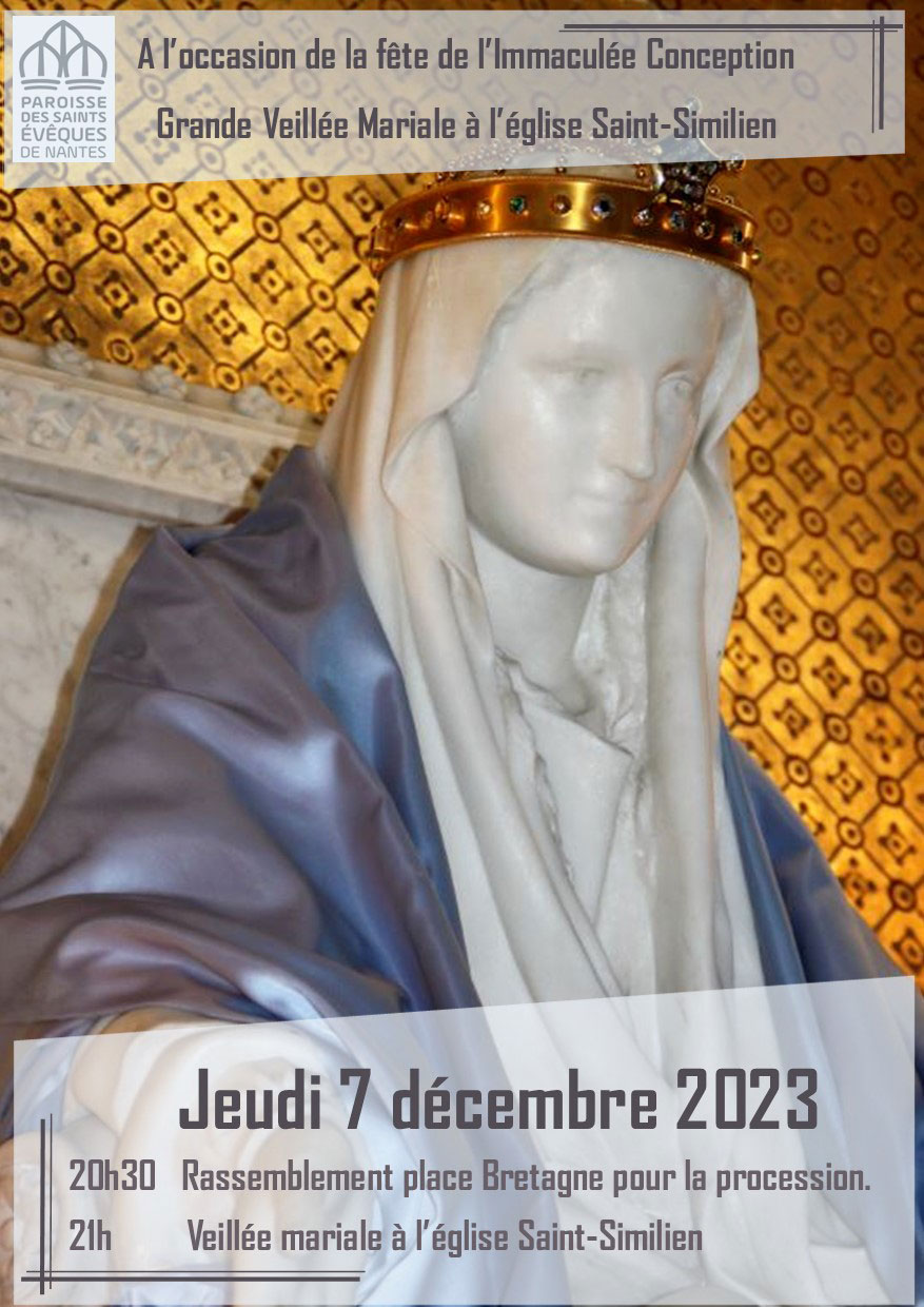 Grande veillée mariale en l’église Saint-Similien de Nantes à l’occasion de la fête de l’immaculée Conception organisée par la paroisse des Saints-Évêques-de-Nantes jeudi 7 décembre 2023 de 20h30 à 22h.