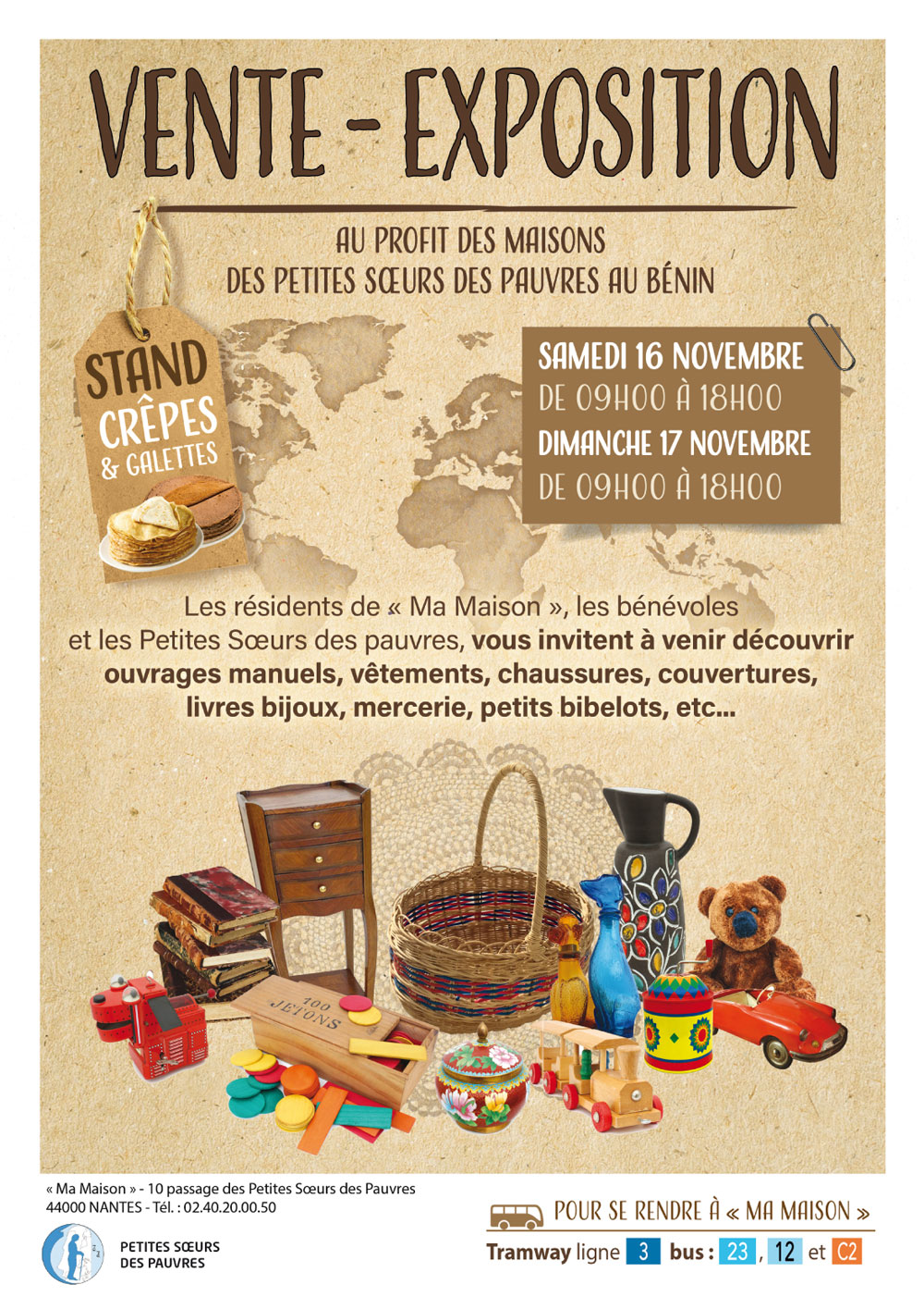Les résidents de « Ma Maison« , les bénévoles et les Petites Sœurs vous invitent à venir découvrir ouvrages manuels, vêtements, chaussures, couvertures, livres, bijoux, mercerie, petits bibelots, etc.