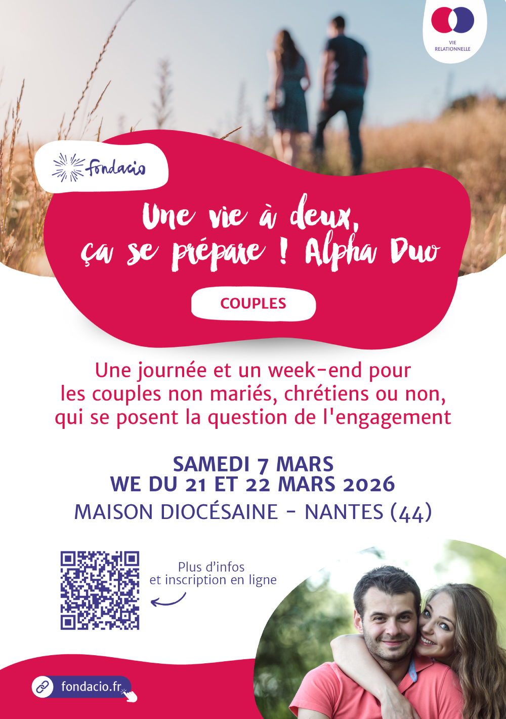 Une vie à deux, ça se prépare ! 7 mars 2026 / 9h30 - 18h30 Maison diocésaine Saint-Clair 7 Chemin de la Censive du Tertre, Nantes, France Parcours Alpha Duo sur 3 journées à Nantes
