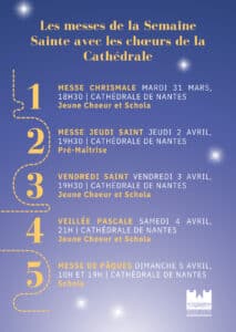 - Vendredi 3 avril à 19h30 : Vendredi Saint, Office de la Passion à la cathédrale de Nantes
