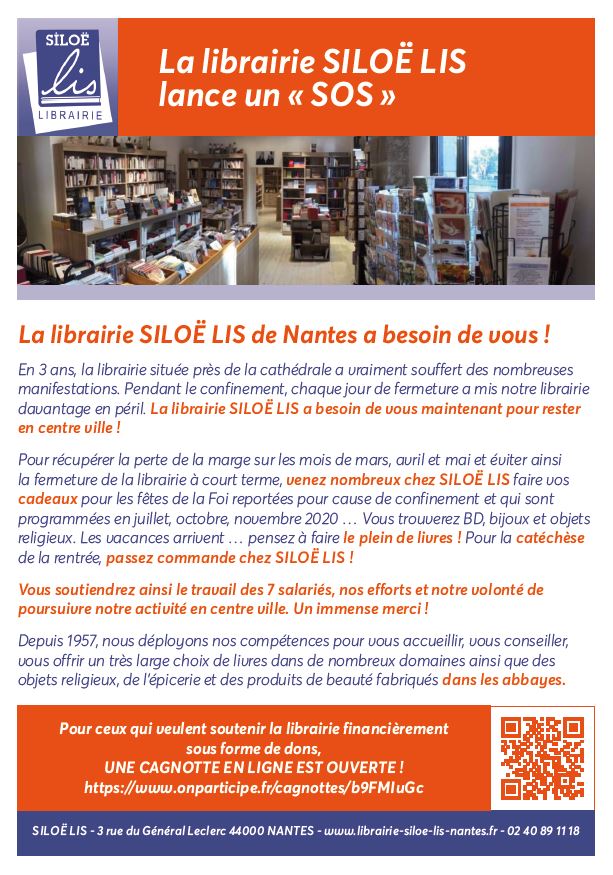 La librairie Siloë Lis lance un SOSDepuis 1957, cette librairie diocésaine déploie ses compétences pour accueillir, conseiller, offrir un très large choix de livres dans de nombreux domaines ainsi que des objets religieux, de l’épicerie et des produits de beauté fabriqués dans les abbayes. Depuis 3 ans, la librairie située près de la cathédrale a souffert des nombreuses manifestations. Pendant le confinement, chaque jour de fermeture l’a un peu plus fragilisée. C’est pourquoi une cagnotte en ligne a été ouverte pour récupérer la perte de la marge sur les mois de mars, avril et mai (60 000€) et éviter la fermeture de la librairie à court terme. Les premiers dons arrivent et toute l’équipe espère un bel élan de générosité : quel que soit le montant de votre participation, celle-ci les aidera !
