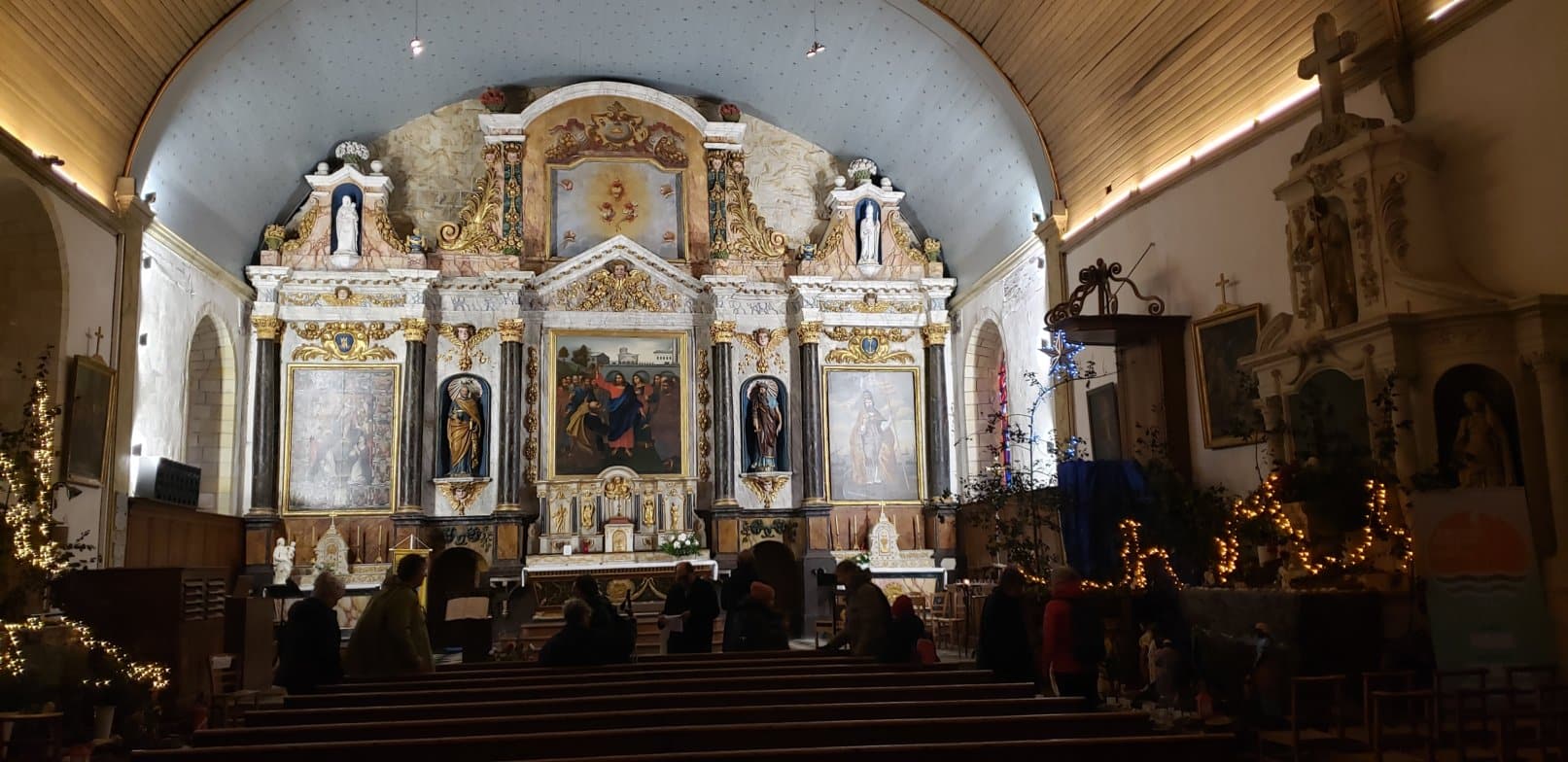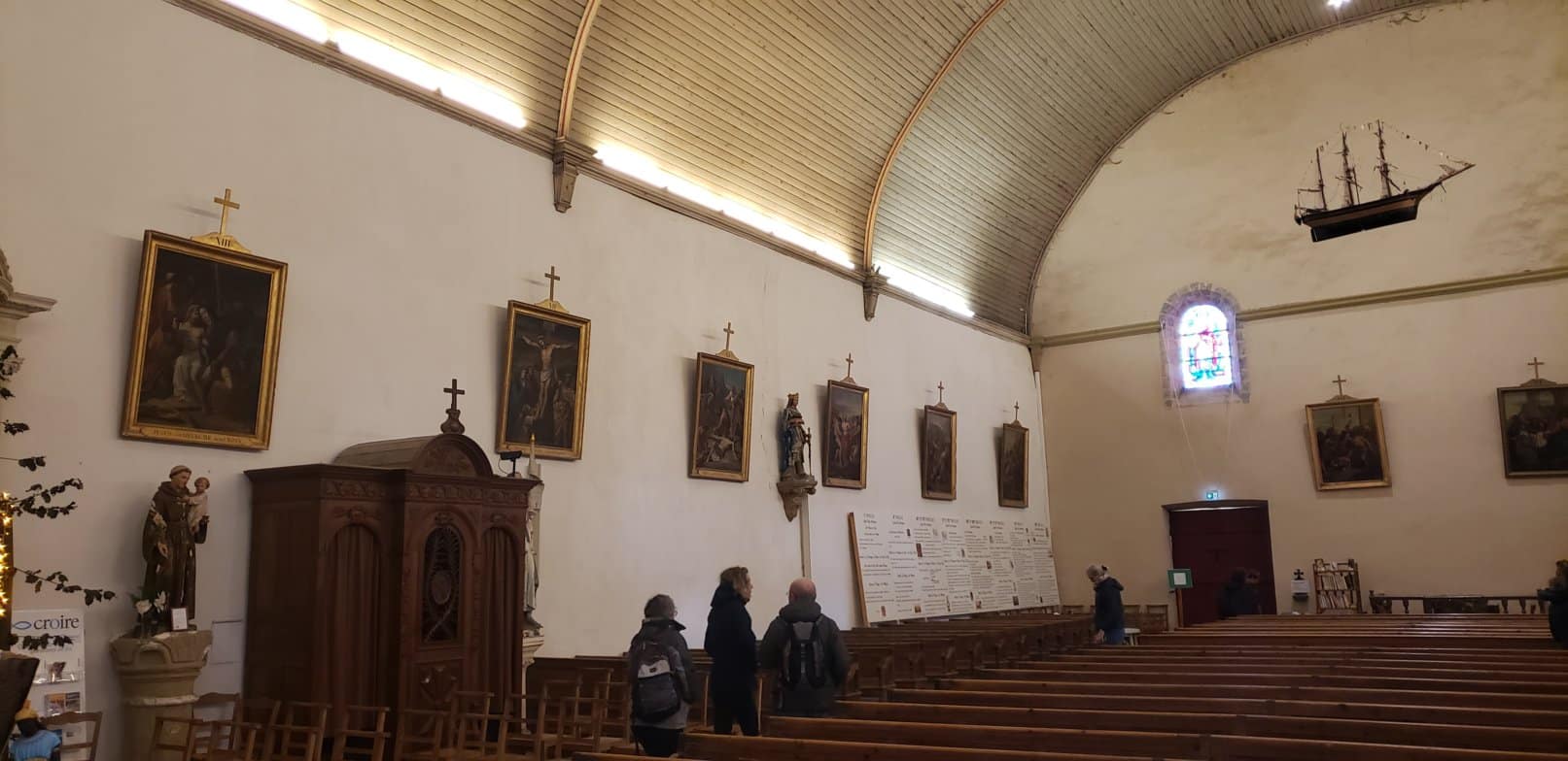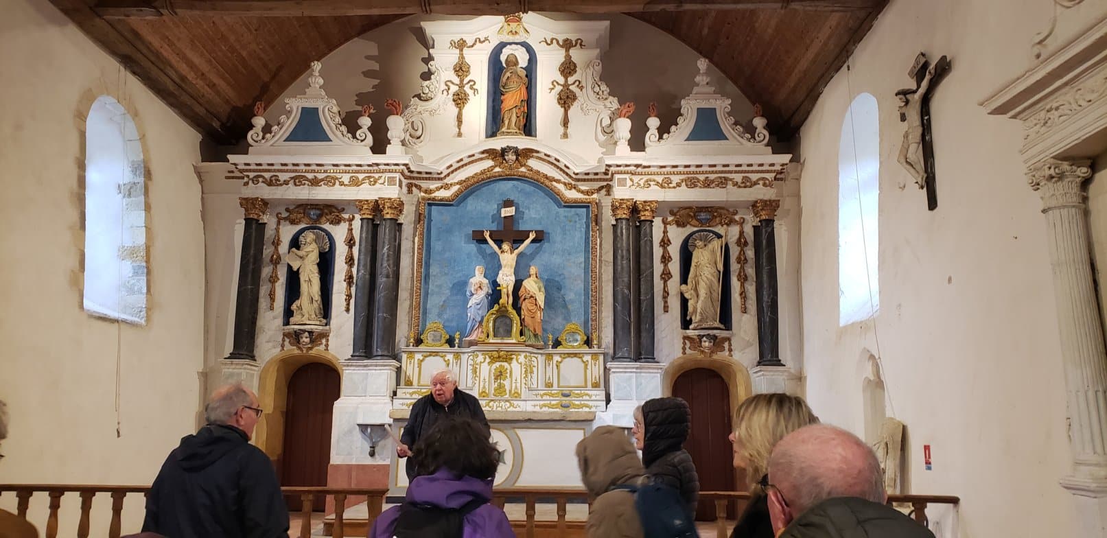 Nous rejoignons ensuite l’église Saint-Pierre des Moutiers où nous attend un historien : sur le placître, l’ancien cimetière a disparu mais reste une « Lanterne des morts » que l’on allume entre le décès et l’inhumation d’un habitant; y faisait face une autre église, celle d’un monastère, détruite à ce jour, qui vivait entre autres du sel. Grand retable intérieur, dont les différentes représentations servaient d’outils d’apprentissage des dogmes, des confréries , des missions… Statues de St-Jean-Baptiste, Saint-Joseph, bel ex-voto bateau.