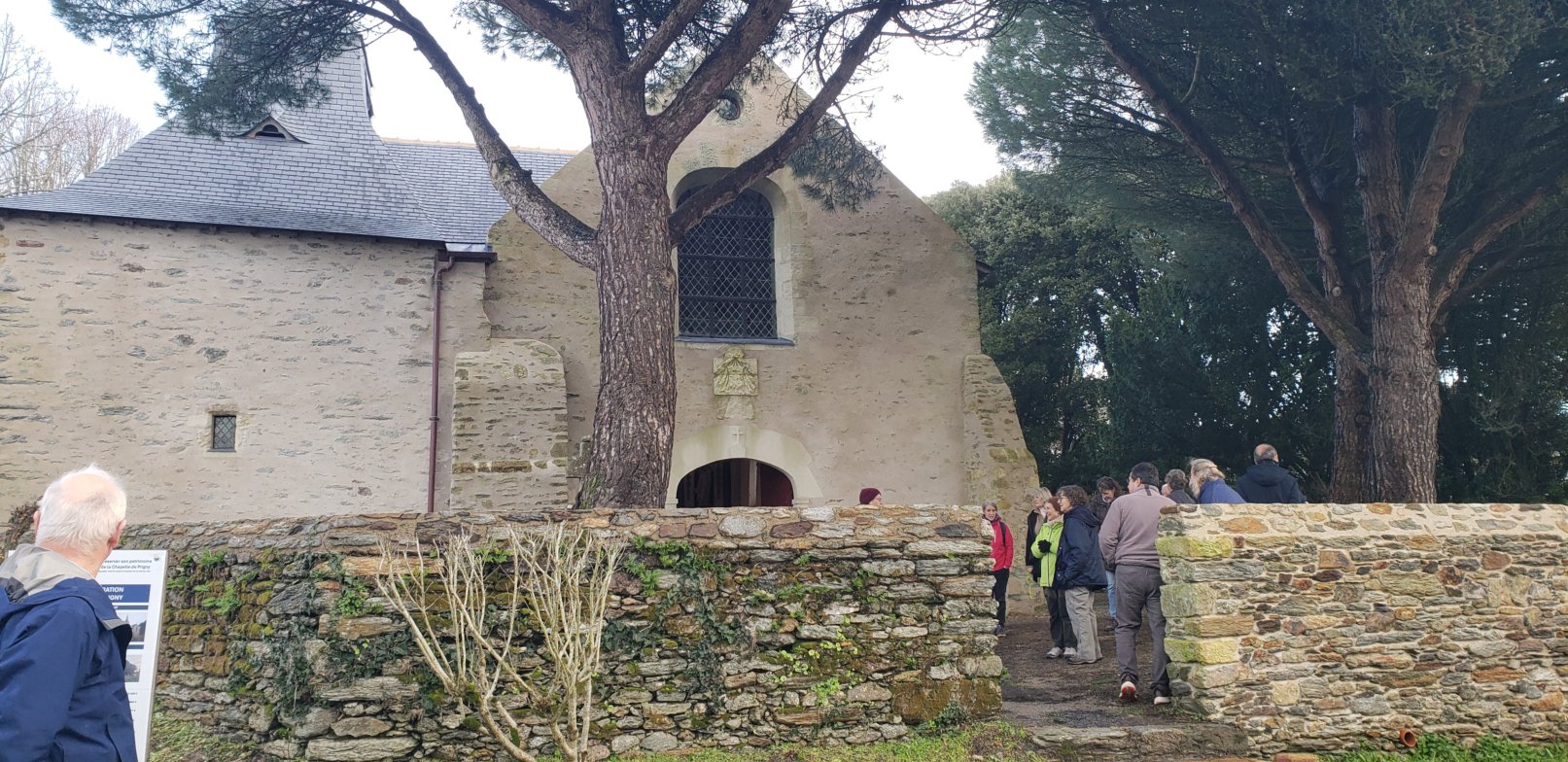 Ce dimanche 1er février 2026, Marie-Thérèse de la Fraternité Saint-Donatien Saint-Rogatien a donné rendez-vous sur la Côte de Jade aux fidèles marcheurs du Tro Breiz; nous assistons à la messe paroissiale de La Bernerie en Retz en l’église Notre-Dame de Bonsecours qui se clôt par un Da feiz hon Tadou kozh, photo-souvenir autour de la bannière, avant de se diriger vers la chapelle de PRIGNY aux Moutiers, classée monument historique, située sur une éminence rocheuse, que nous commente un passionné; édifiée au XI° siècle, art roman primitif, au clocher massif, sur un axe nord-sud, près d’un château; la mer était autrefois à ses pieds, ainsi qu’un port! Un cimetière jouxtait la chapelle, il reste un mur d’enclos avec sa « pierre à cochons » barrant l’accès aux animaux mal-venus! On pourra admirer une partie de sa charpente !