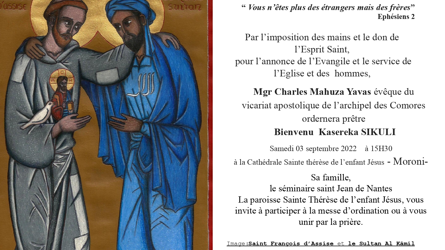 Ce samedi 3 septembre 2022, Mgr Charles Mahuza Yava, s.d.s. Vicaire apostolique de l’Archipel des Comores (Mayotte) a présidé l’ordination sacerdotale de Bienvenu Sikuli, à Moroni, l’une des îles des Comores. Bienvenu a fait toutes ses années de séminaire à Nantes et a été ordonné diacre à l’église Sainte-Thérèse, l’an dernier en même temps que les pères Bouchaud et de Vasselot.