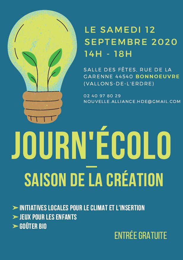 Dans le cadre de la Saison de la Création, la paroisse Nouvelle Alliance Hauts de l’Erdre proposait une Journ’écolo à Bonnoeuvre (Vallons-de-l’Erdre) le samedi 12 septembre 2020 avec le forum Journ’écolo et la présentation de la démarche Église Verte par Arnaud du Crest.